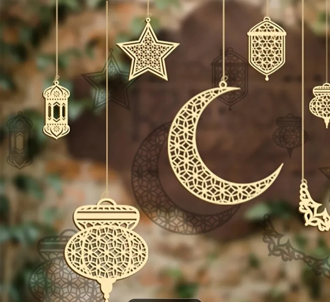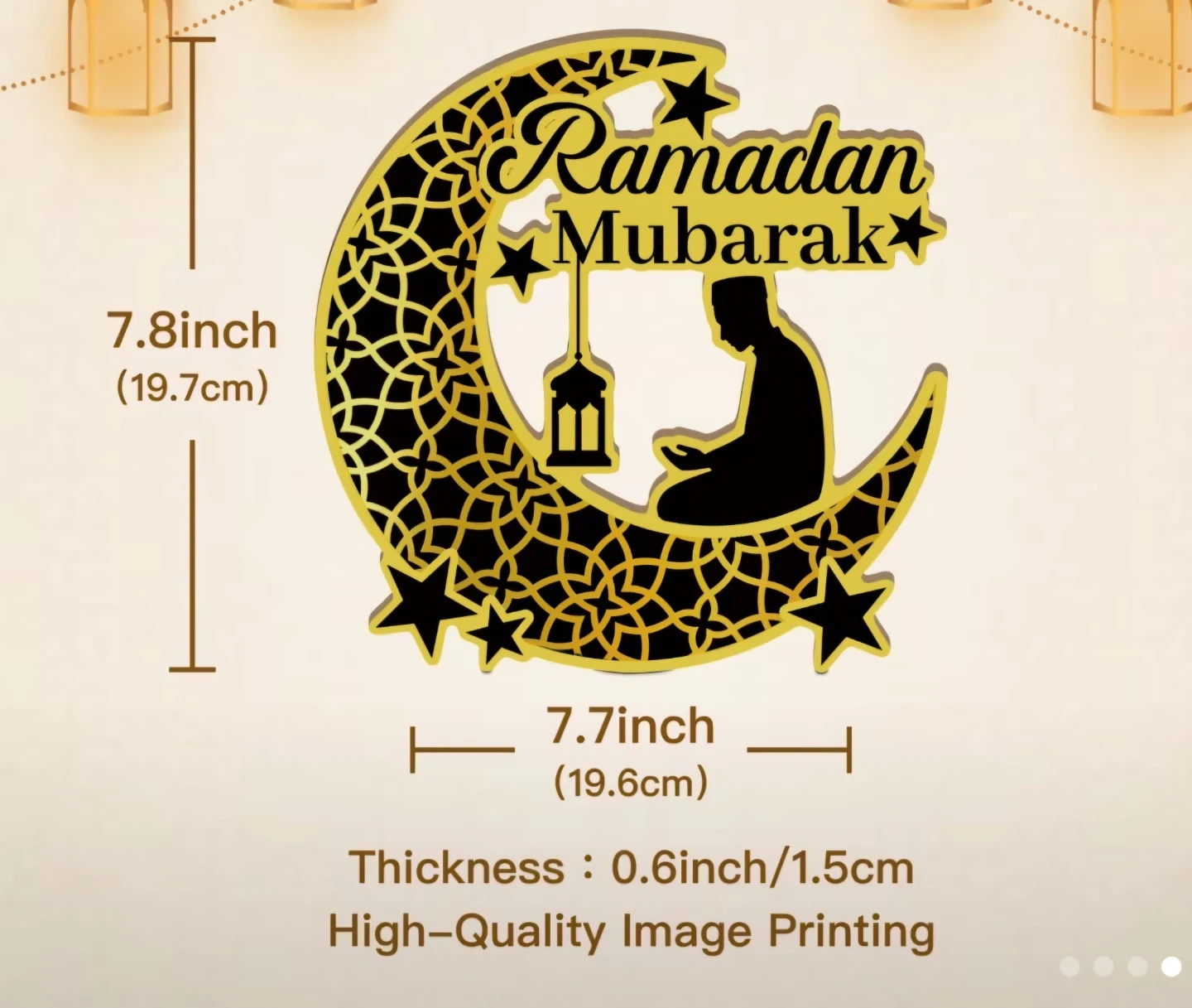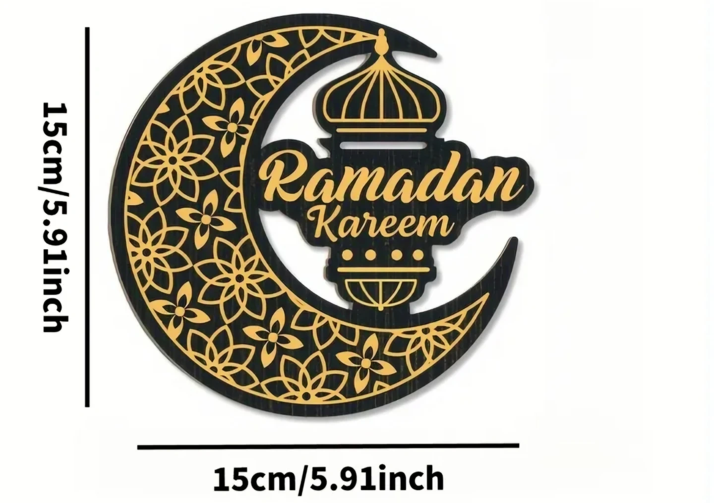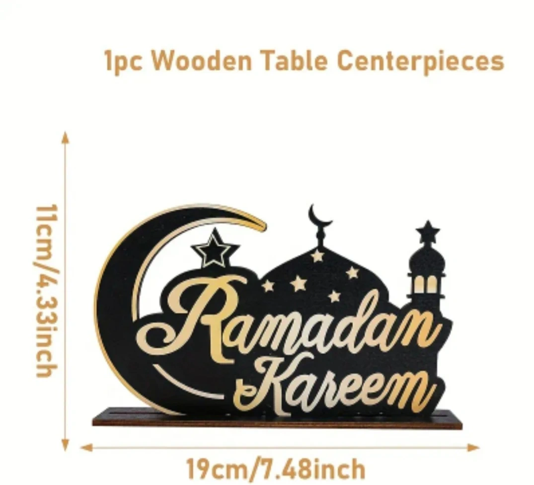 Decorative wooden tabletop centerpiece for Ramadan. It features a crescent moon and mosque design with 'Ramadan Kareem' text. Dimensions are 19cm wide and 11cm high. This piece is great for adding festive decor to your home during the holy month!