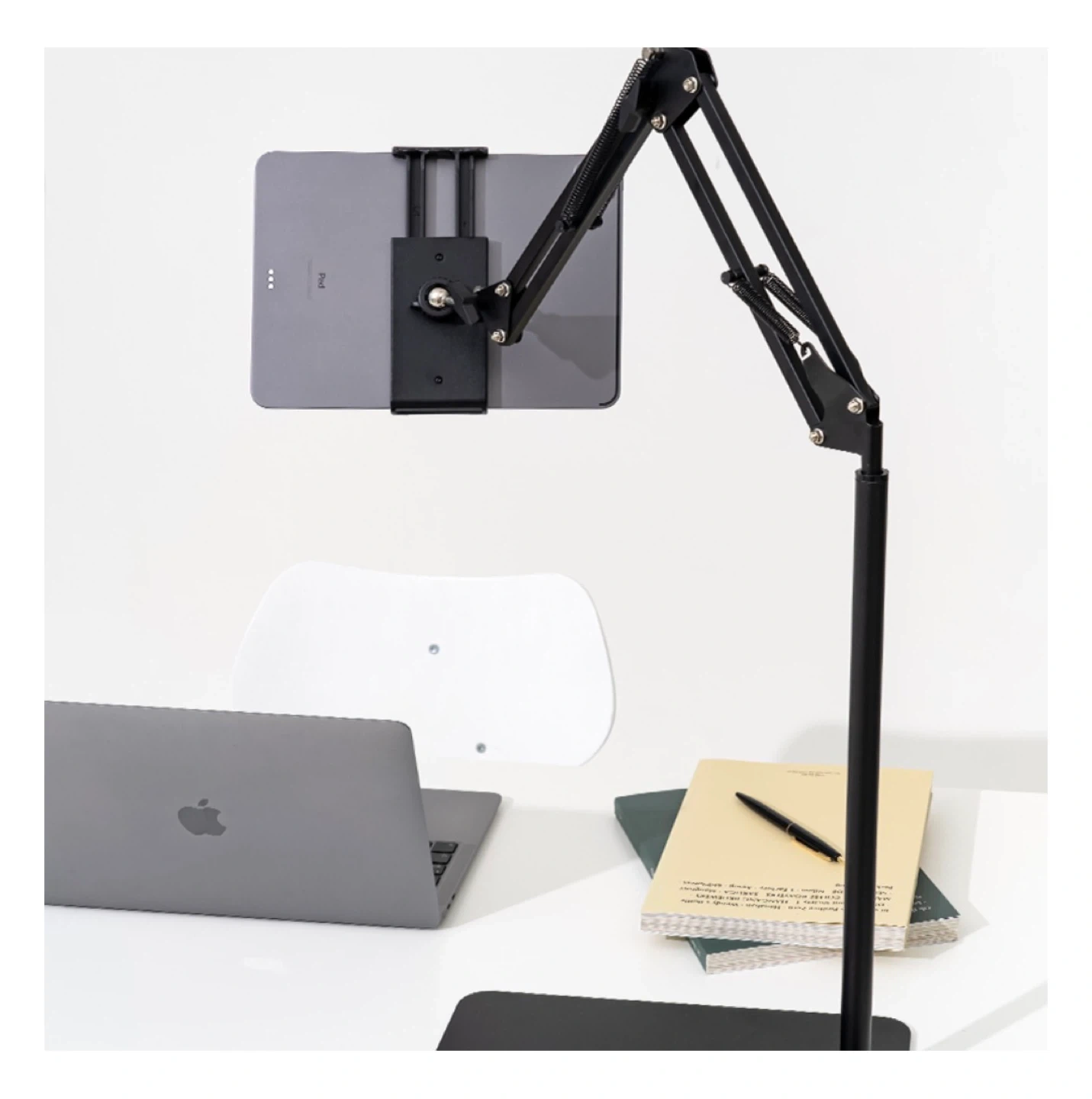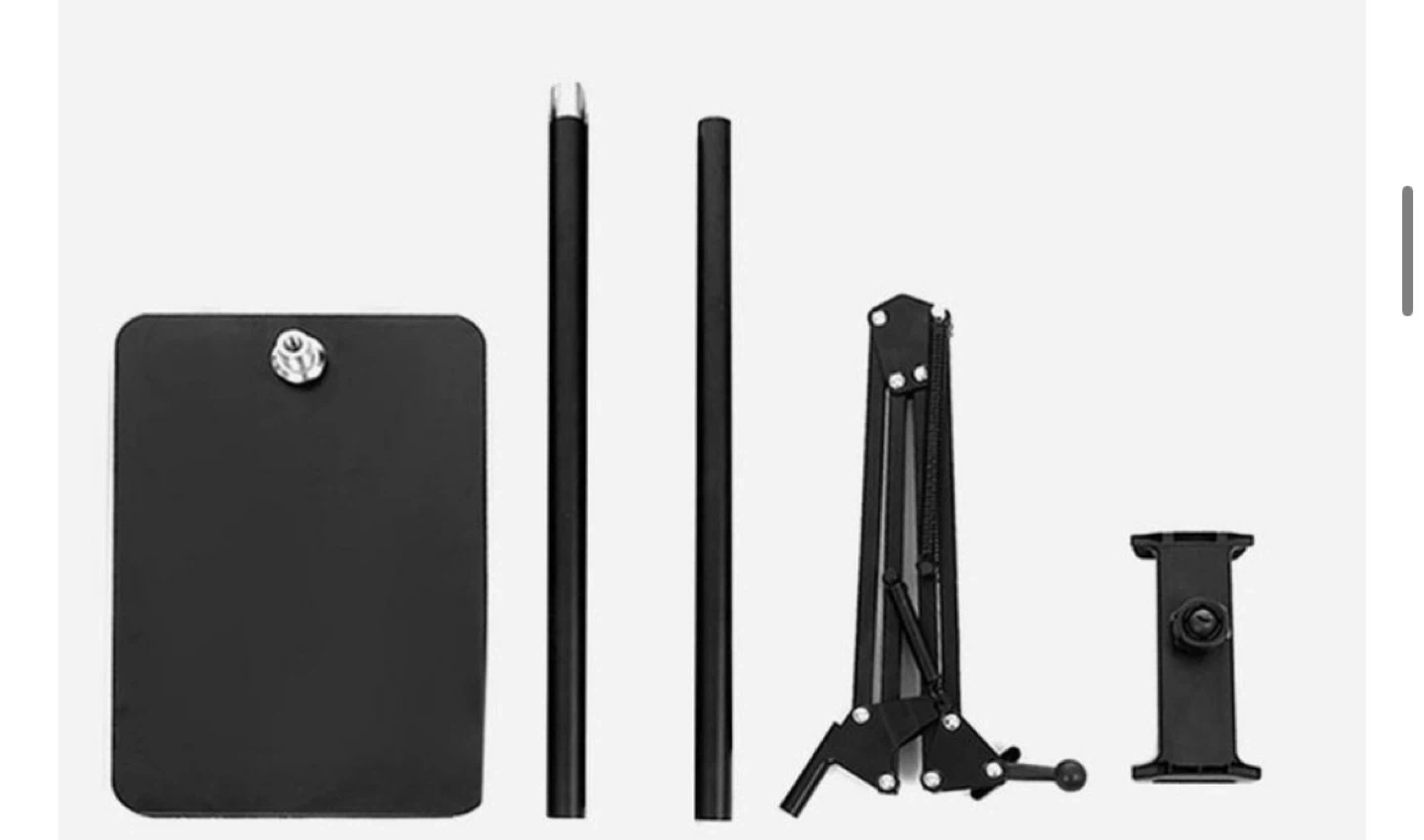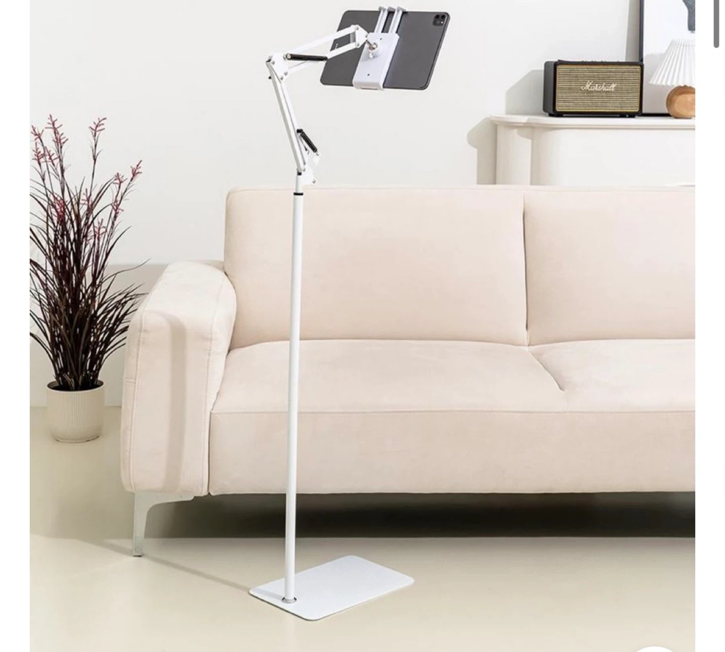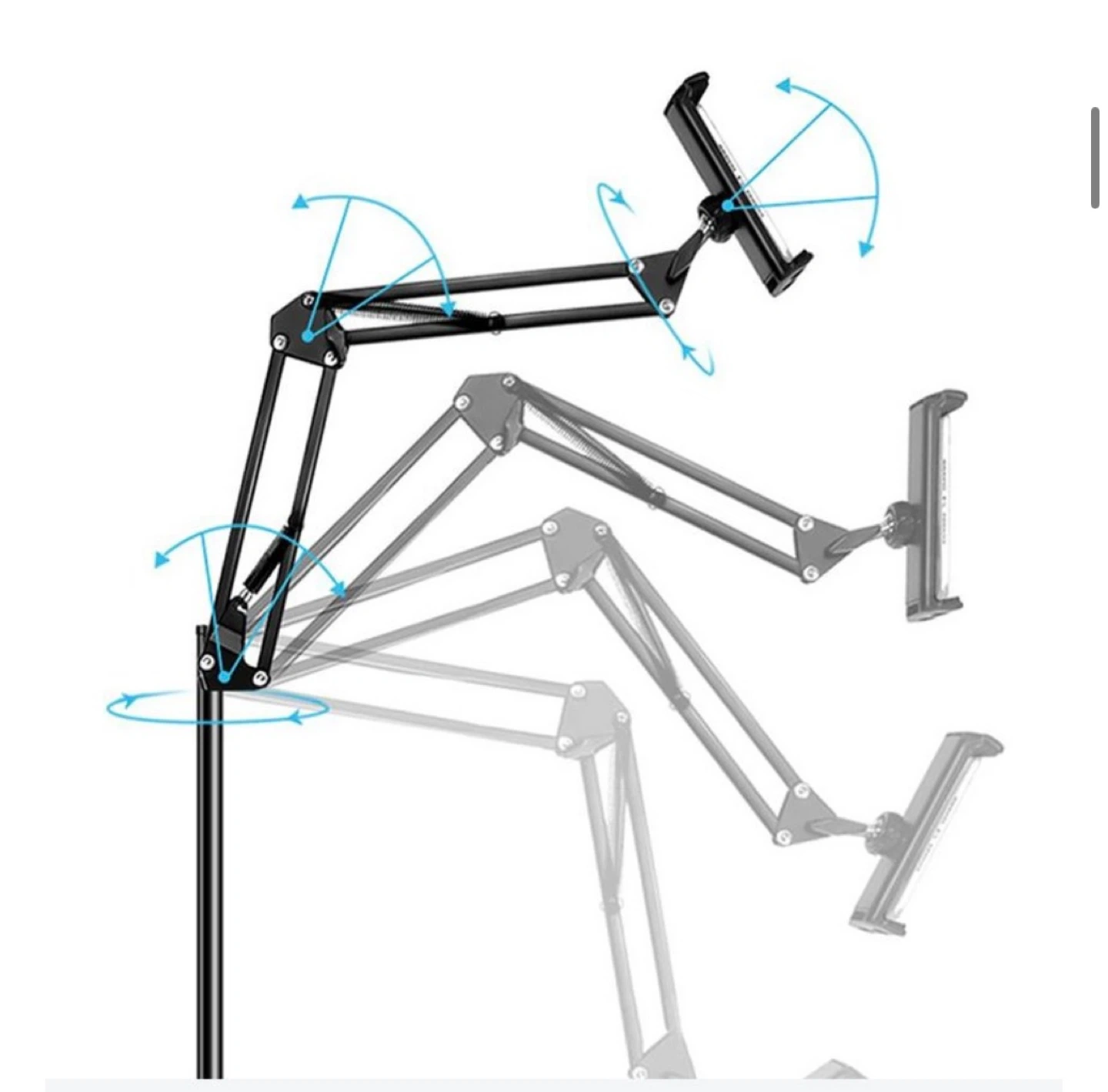 Here's an adjustable tablet floor stand, perfect for hands-free viewing! It's in great shape and ready to use. The stand is black and features adjustable arms for the perfect viewing angle. It measures 80cm in height.