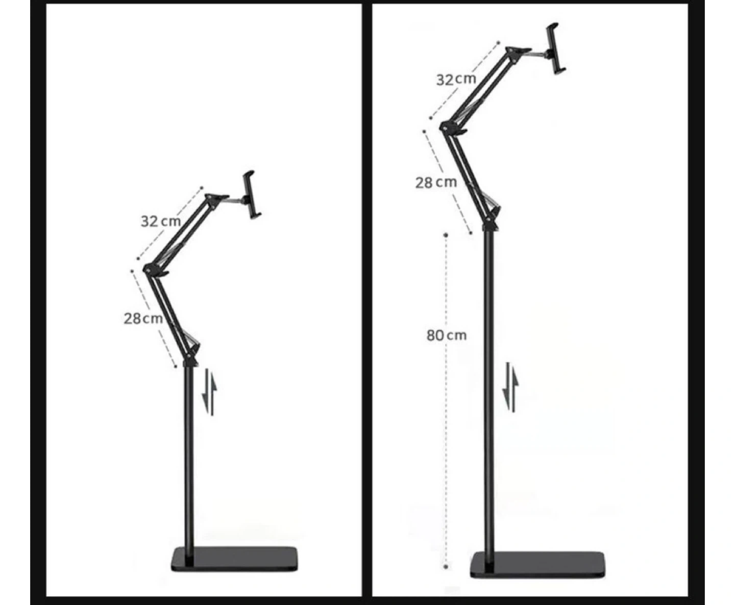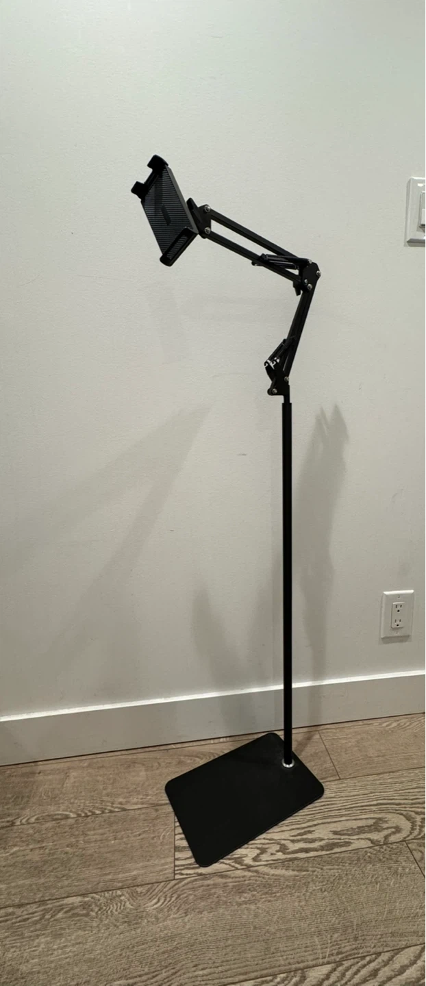 Here's an adjustable tablet floor stand, perfect for hands-free viewing! It's in great shape and ready to use. The stand is black and features adjustable arms for the perfect viewing angle. It measures 80cm in height.