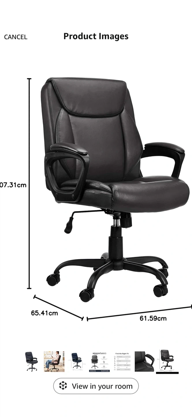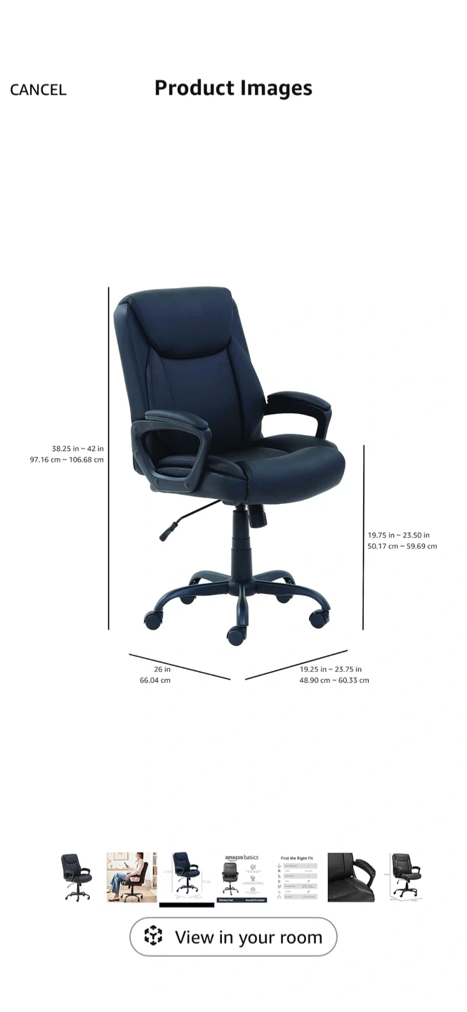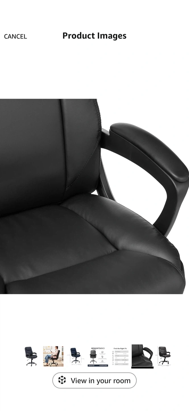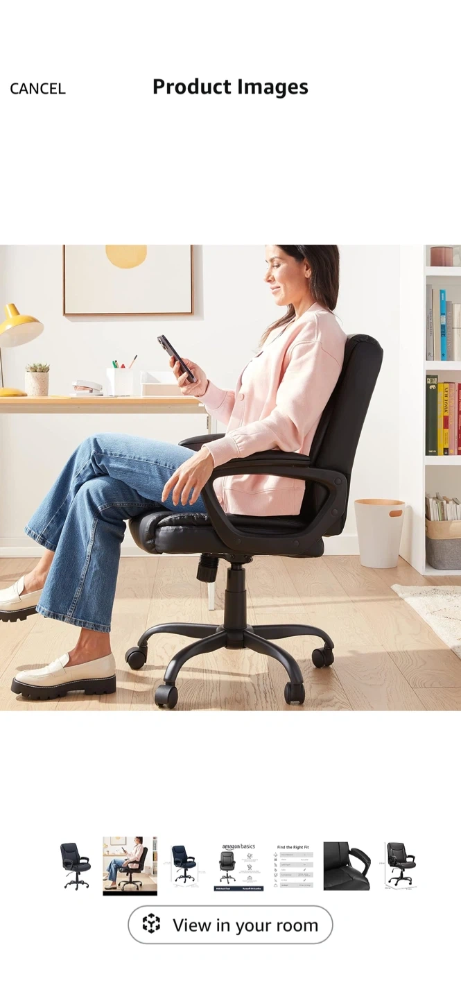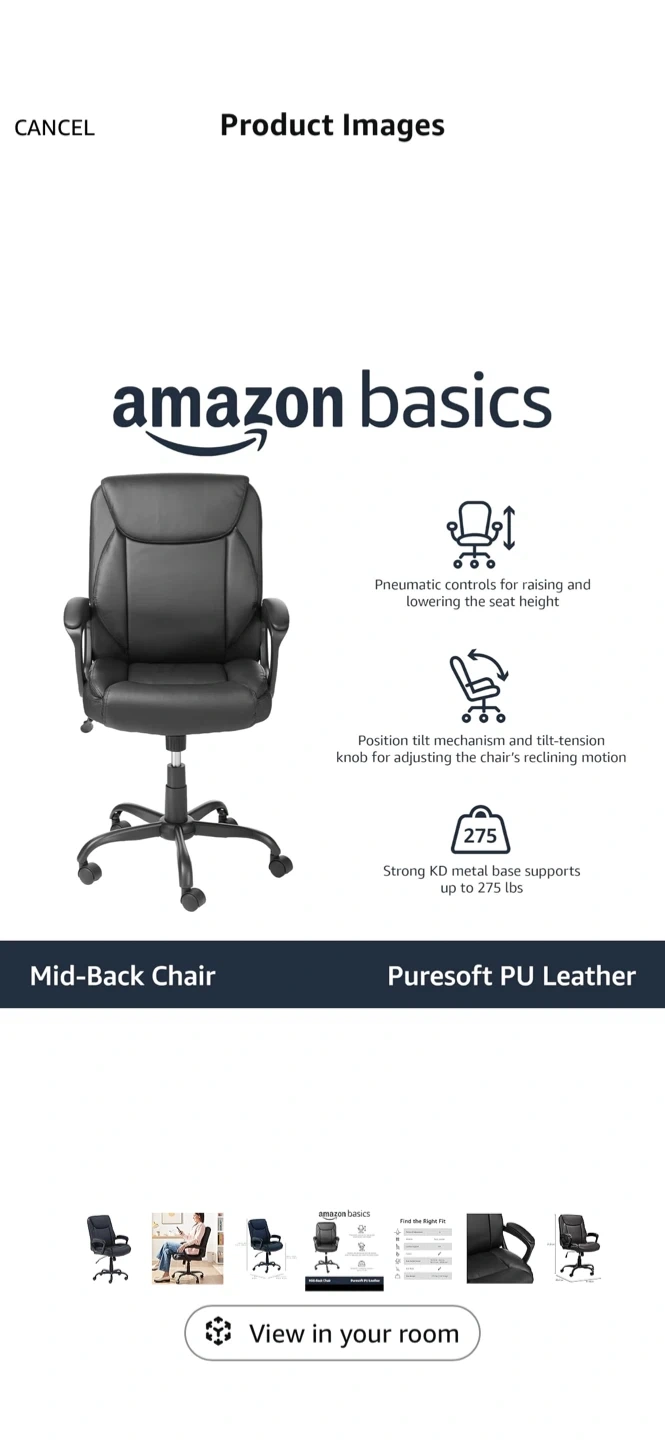 Selling an AmazonBasics Mid-Back Office Chair in black! It's made with Puresoft PU Leather and has pneumatic controls for adjusting the seat height. The chair also features a tilt mechanism and tilt-tension knob to adjust the reclining motion. It can support up to 275 lbs!