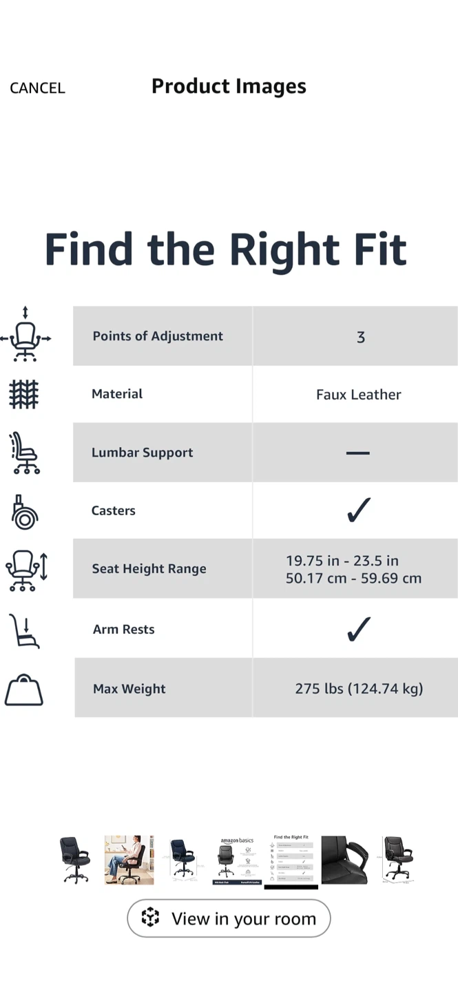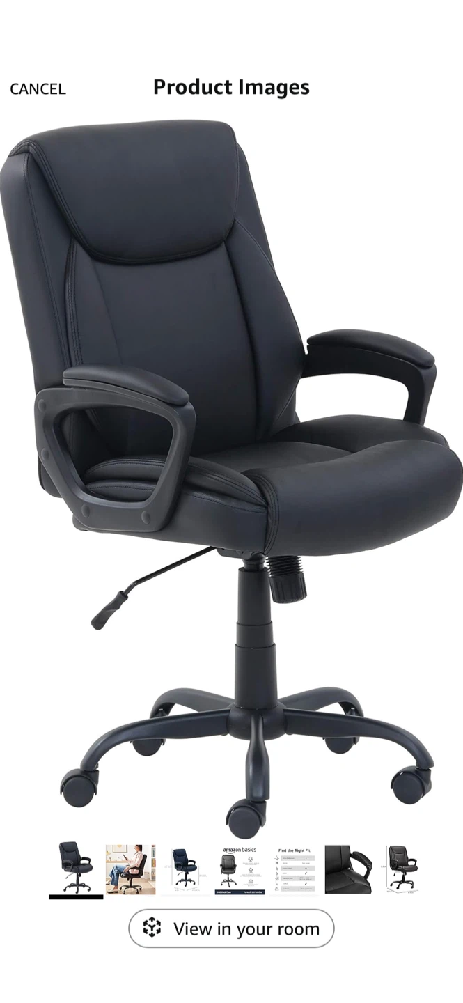 Selling an AmazonBasics Mid-Back Office Chair in black! It's made with Puresoft PU Leather and has pneumatic controls for adjusting the seat height. The chair also features a tilt mechanism and tilt-tension knob to adjust the reclining motion. It can support up to 275 lbs!