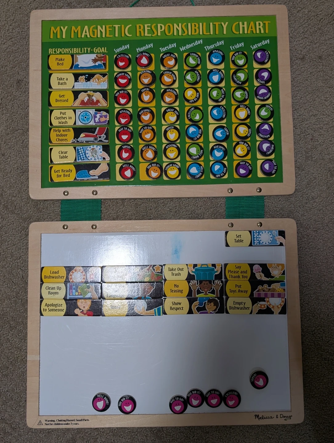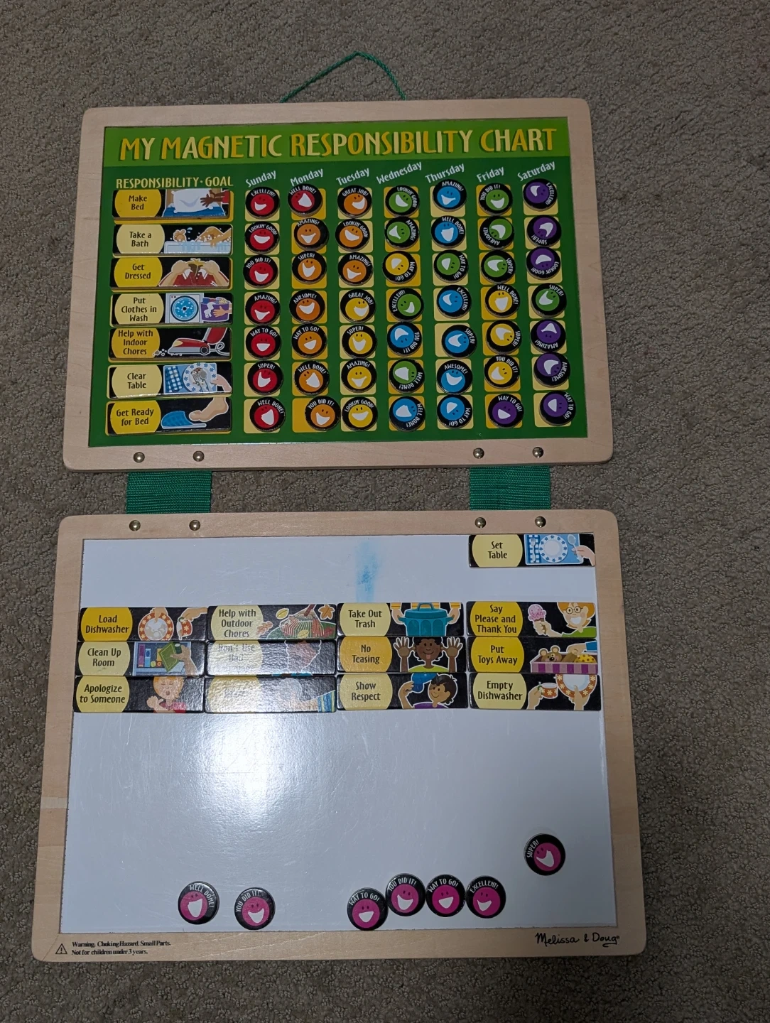 This magnetic chart helps kids track their responsibilities and goals! It's designed to make chores and tasks fun. Includes a whiteboard base for customization and magnetic pieces. Usually used by 3 years and above kid. I have two of them $20 each individually. If purchased together we can negotiate.