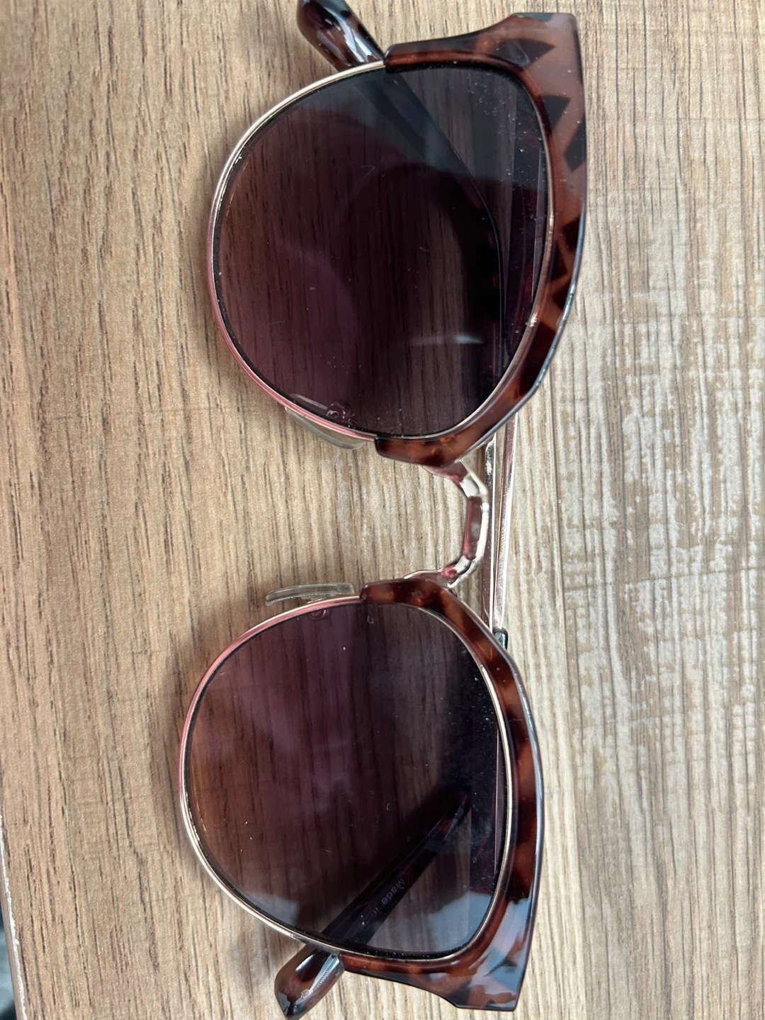 Stylish tortoiseshell round sunglasses. These shades feature a classic design with rose gold accents. They offer good sun protection for everyday wear.