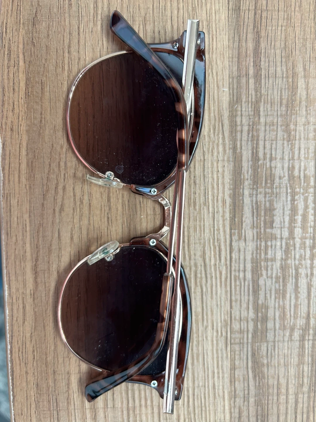 Stylish tortoiseshell round sunglasses. These shades feature a classic design with rose gold accents. They offer good sun protection for everyday wear.