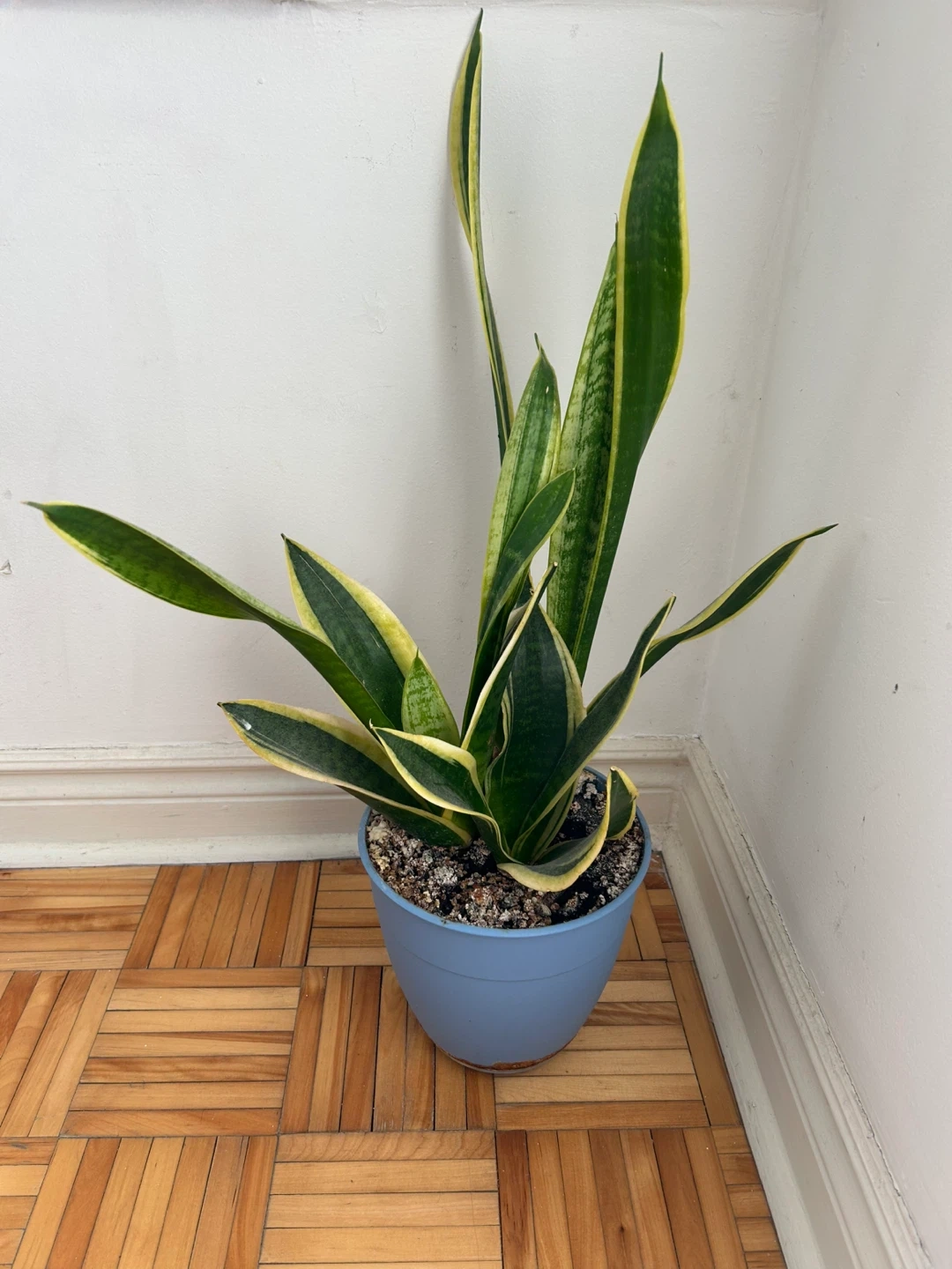 This snake plant features variegated green and yellow leaves. It's potted in a light blue plastic container. This plant requires minimal care and thrives in various light conditions.