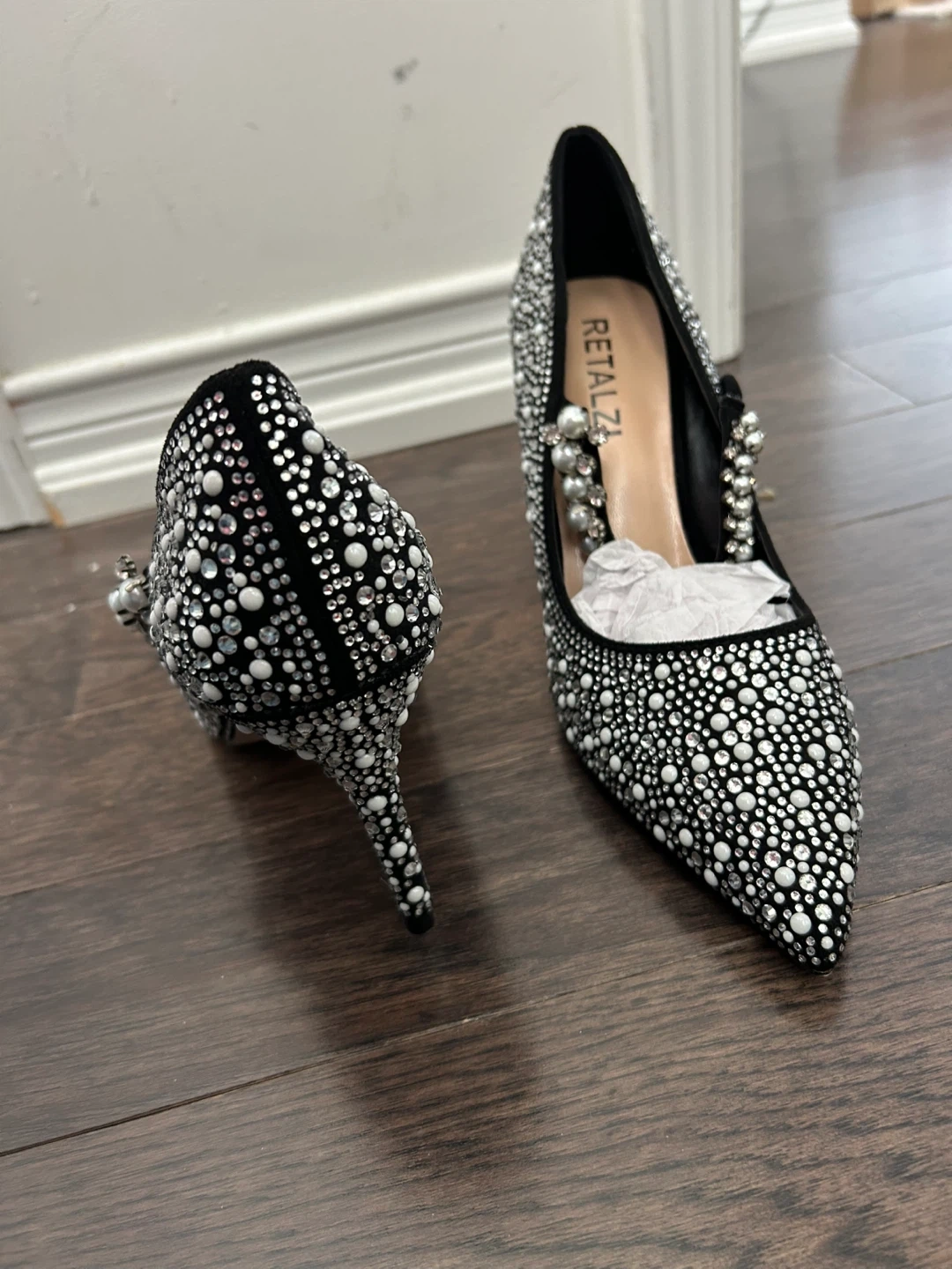 Sparkling embellished stiletto heels from RETALZI. Features a pointed toe and a delicate strap with pearl accents. These shoes add a touch of glamour to any outfit!