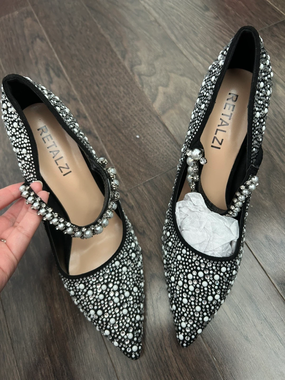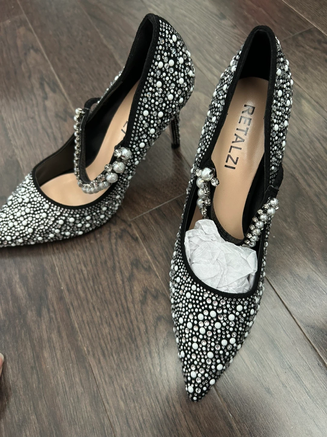 Sparkling embellished stiletto heels from RETALZI. Features a pointed toe and a delicate strap with pearl accents. These shoes add a touch of glamour to any outfit!