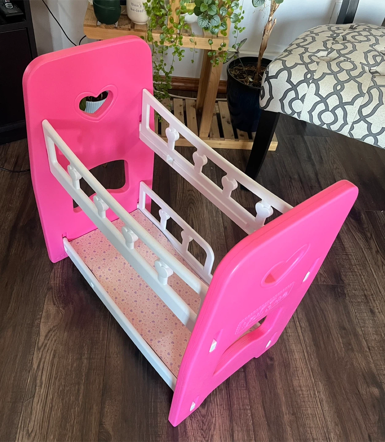 This pink doll bed is designed for imaginative play. It features white railings with heart cutouts and a patterned, cardboard mattress base. Mattress base can be set to high or low. Made of plastic, it's durable for a child's toys.