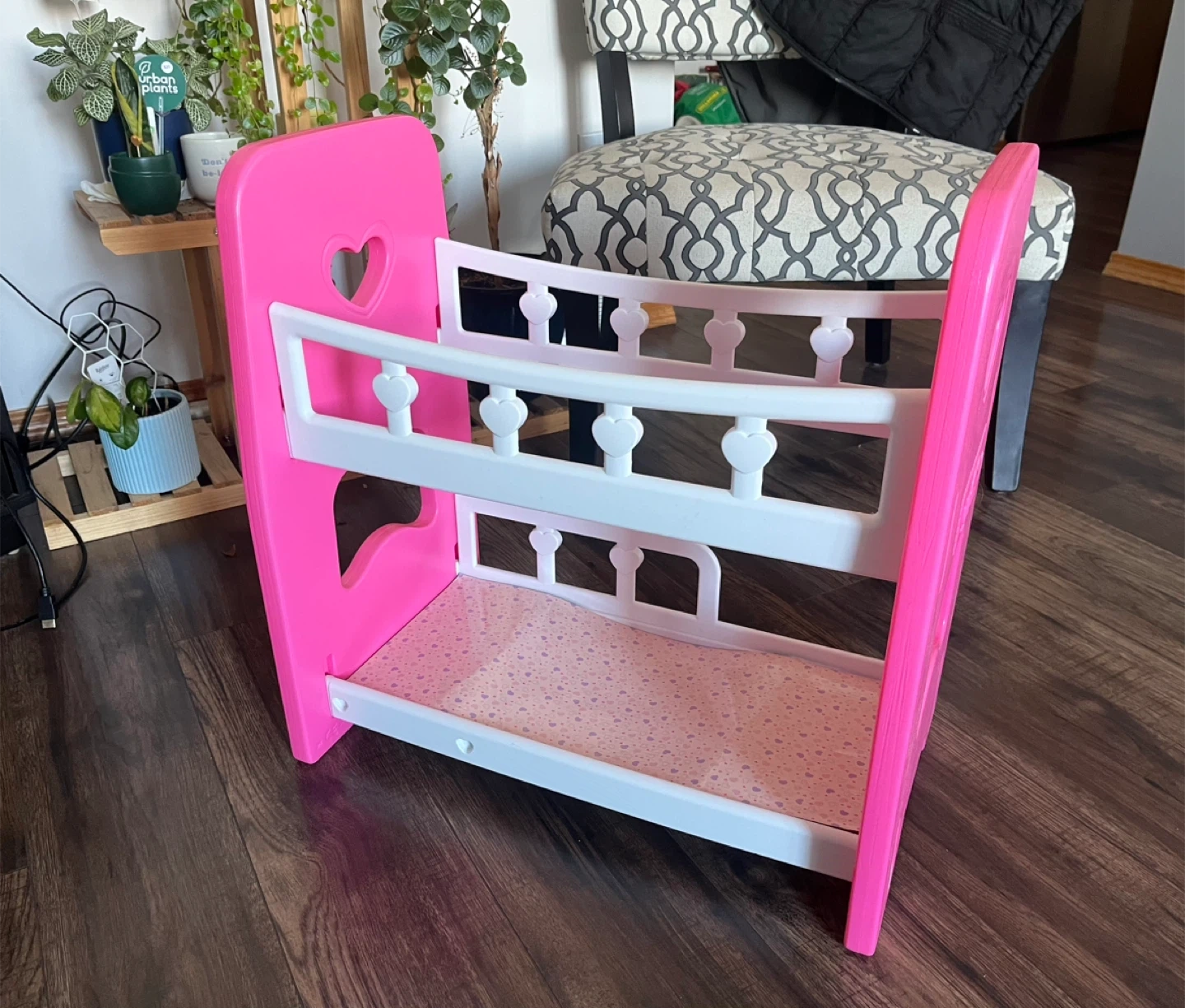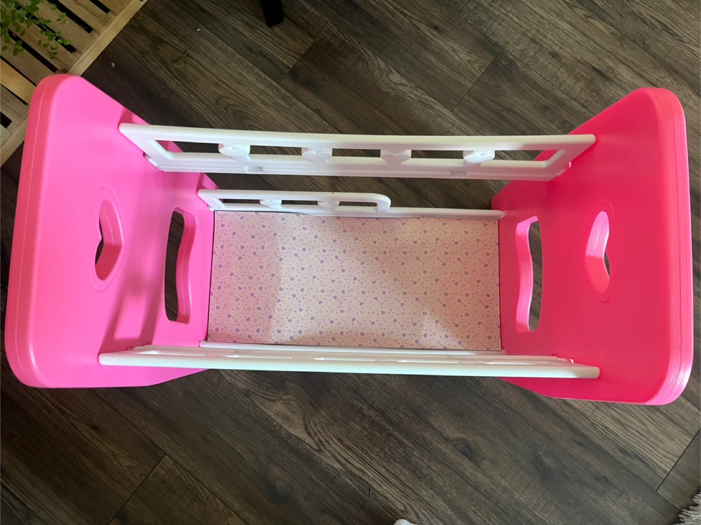 This pink doll bed is designed for imaginative play. It features white railings with heart cutouts and a patterned, cardboard mattress base. Mattress base can be set to high or low. Made of plastic, it's durable for a child's toys.