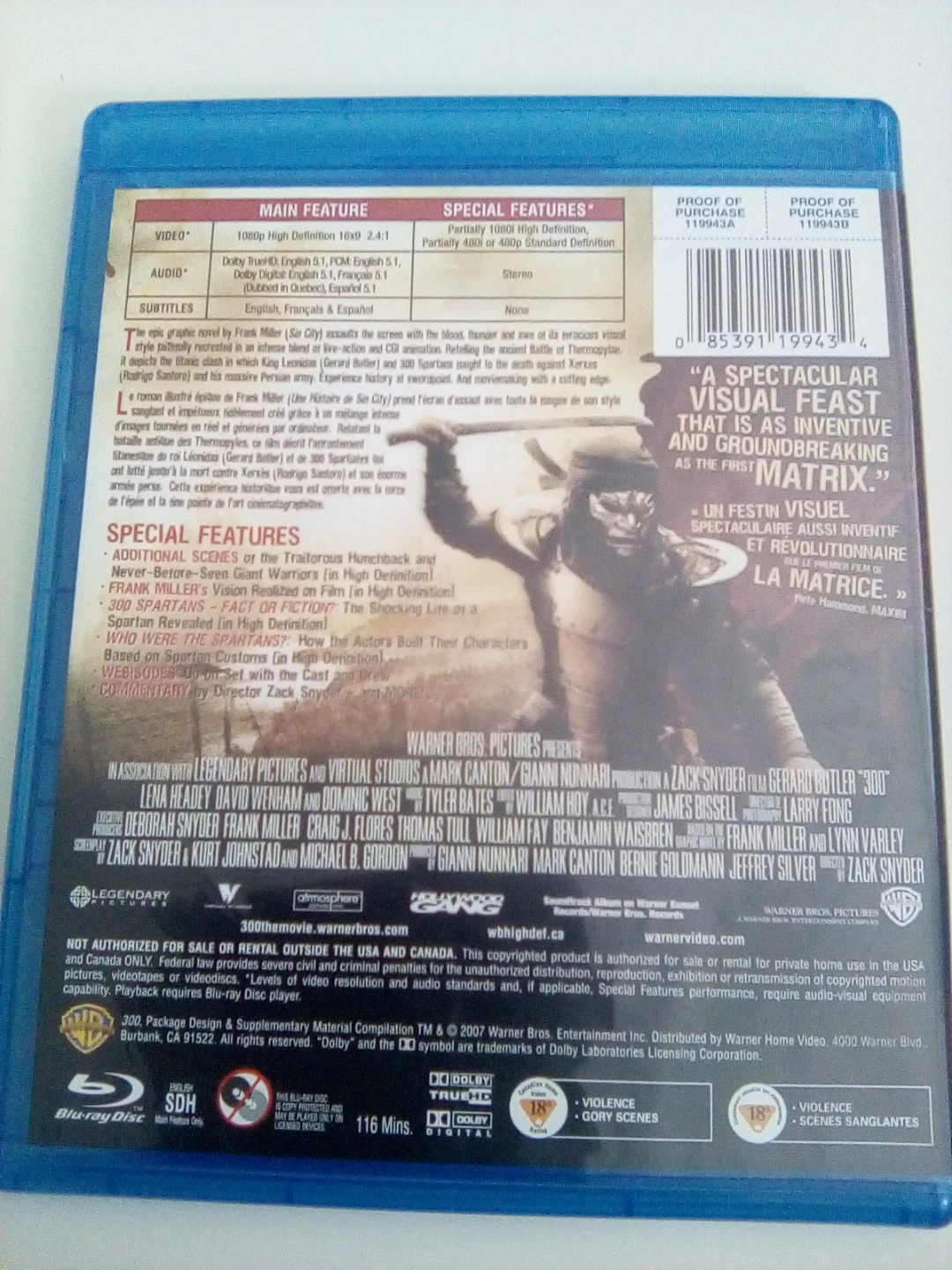 This is the 300 Blu-ray disc movie. It includes main feature and special features. It's presented in 1080p High Definition with Dolby TrueHD 5.1 surround sound.