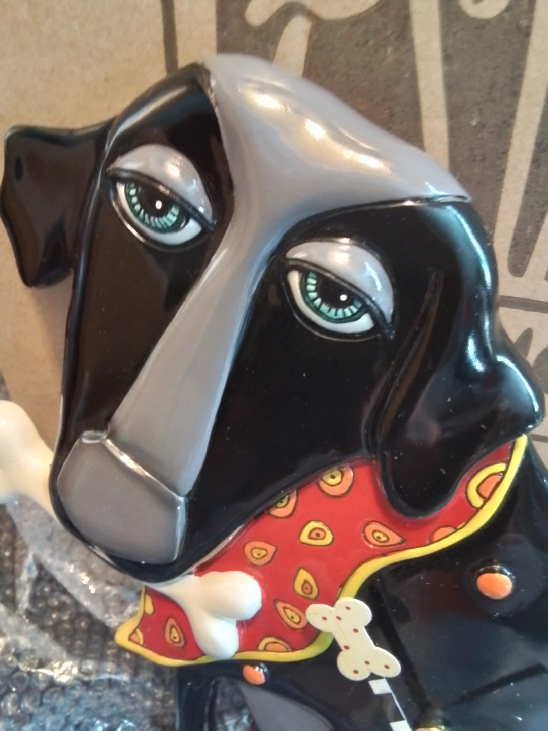 This is a decorative wall clock from Allen Designs, shaped like a black dog wearing a bandana. It has a fun, whimsical design with a bone as the pendulum. This clock would make a great addition to any dog lover's home!