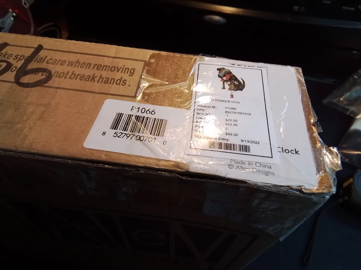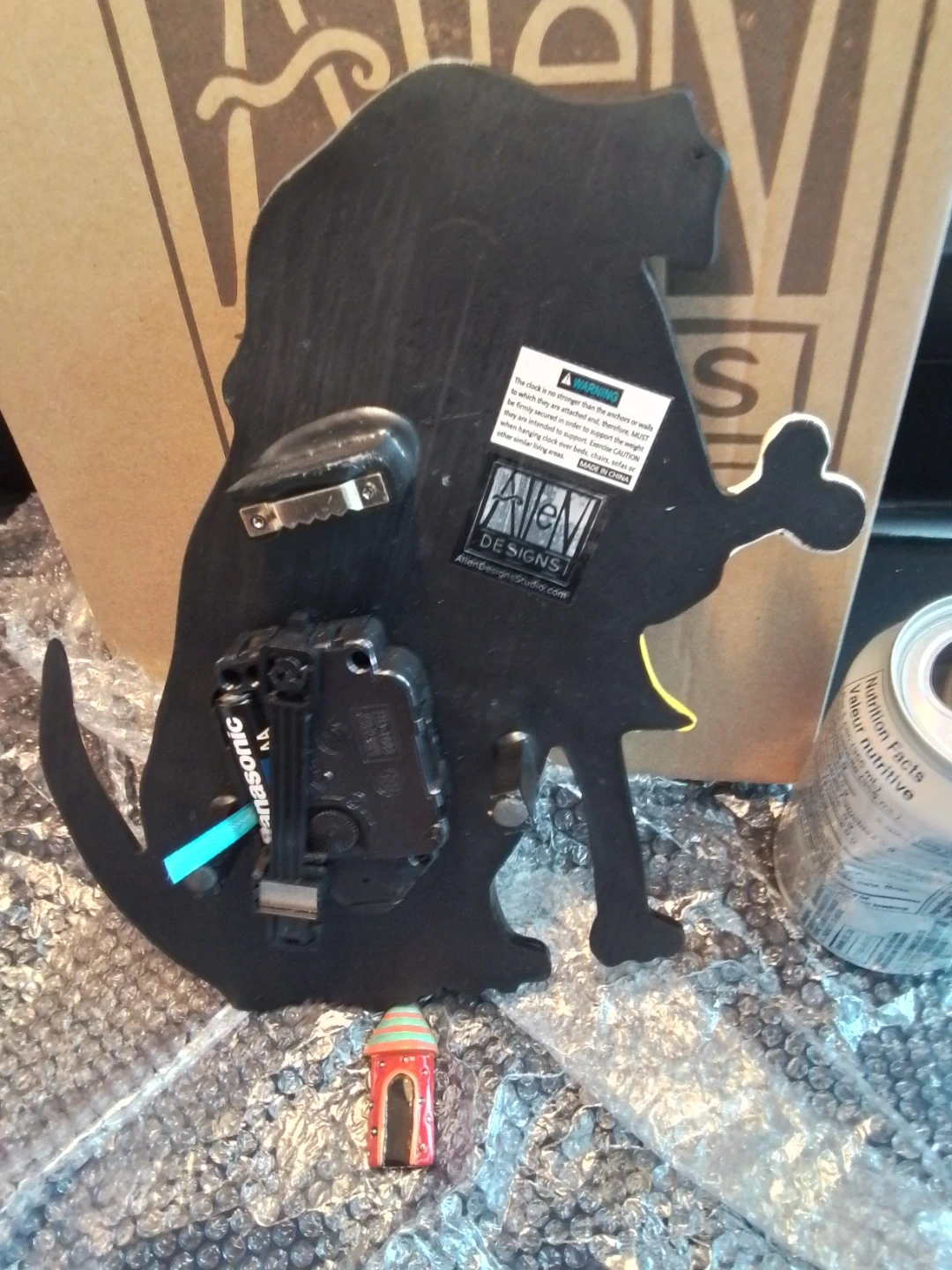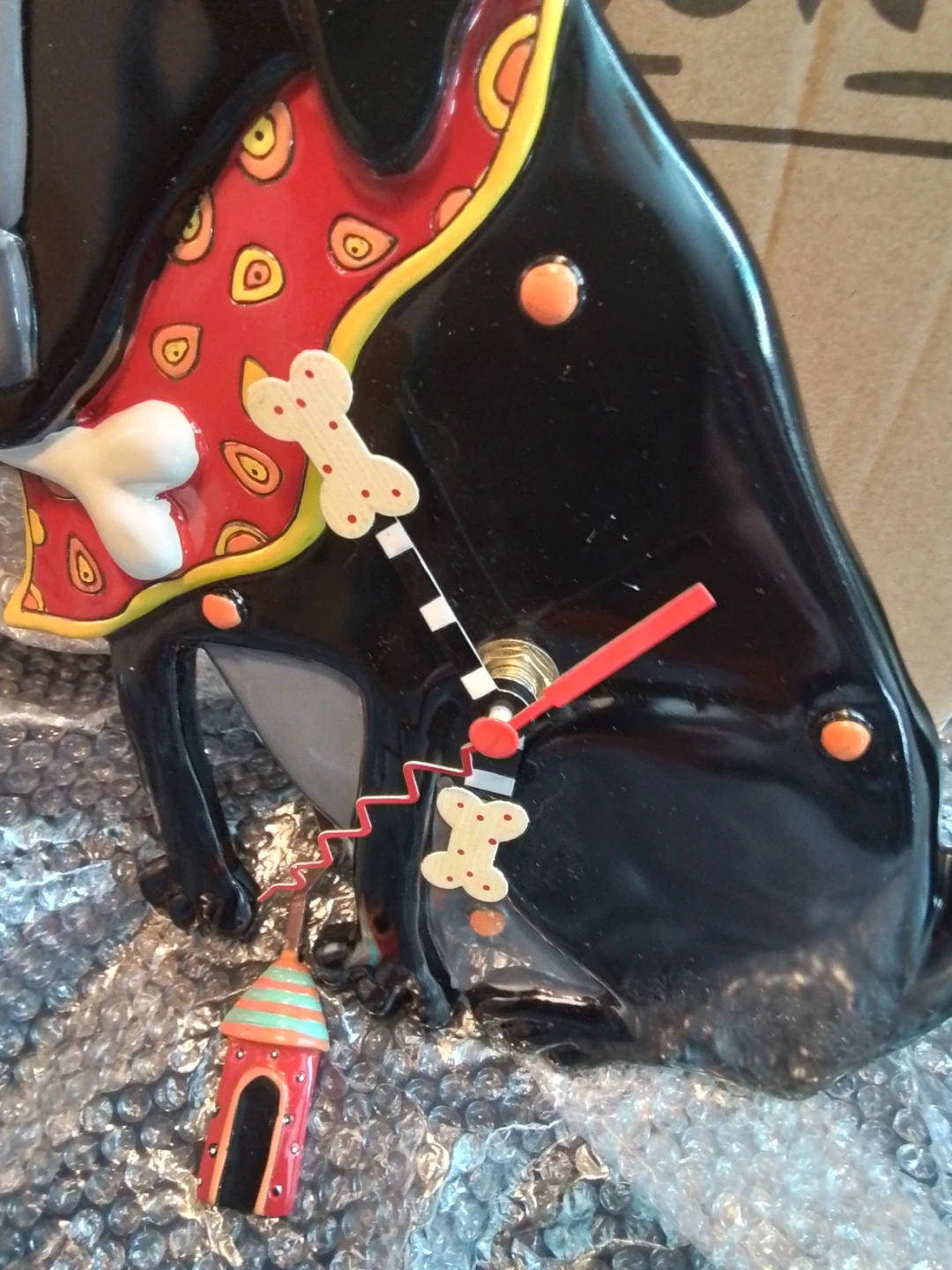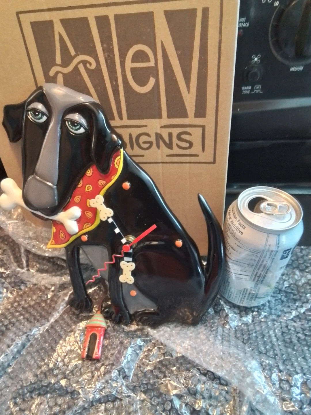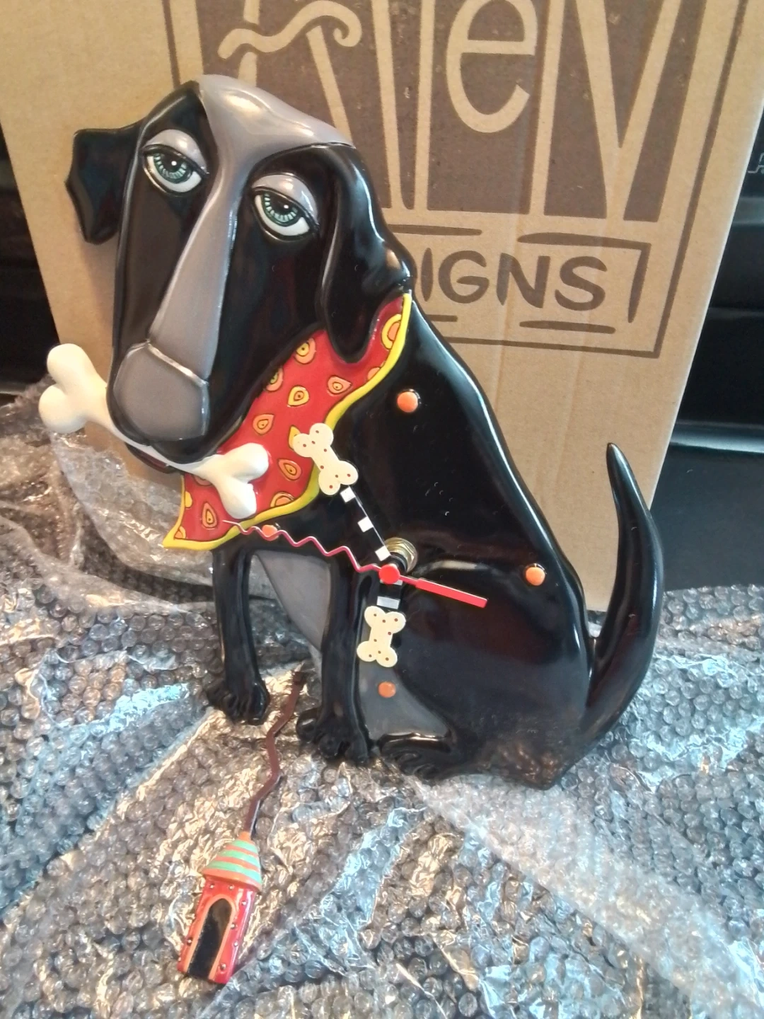 This Allen Designs Parker Dog pendulum wall clock is a charming and whimsical timepiece. It's in good condition, featuring a playful black dog design with bone accents and a wagging pendulum tail. The clock uses one AA battery. Made of resin and metal.