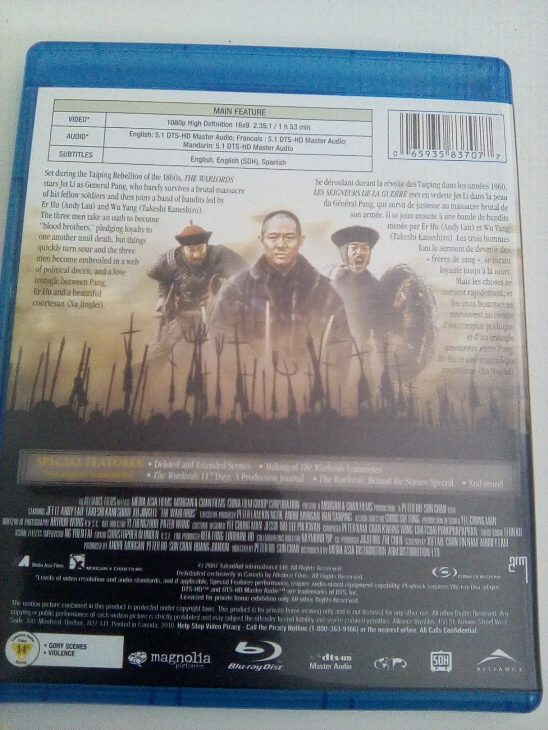 This is a Blu-ray disc of the film The Warlords. It has a runtime of 1 hour and 53 minutes. Features include English 5.1 DTS-HD Master Audio and Mandarin 5.1 DTS-HD Master Audio soundtracks.