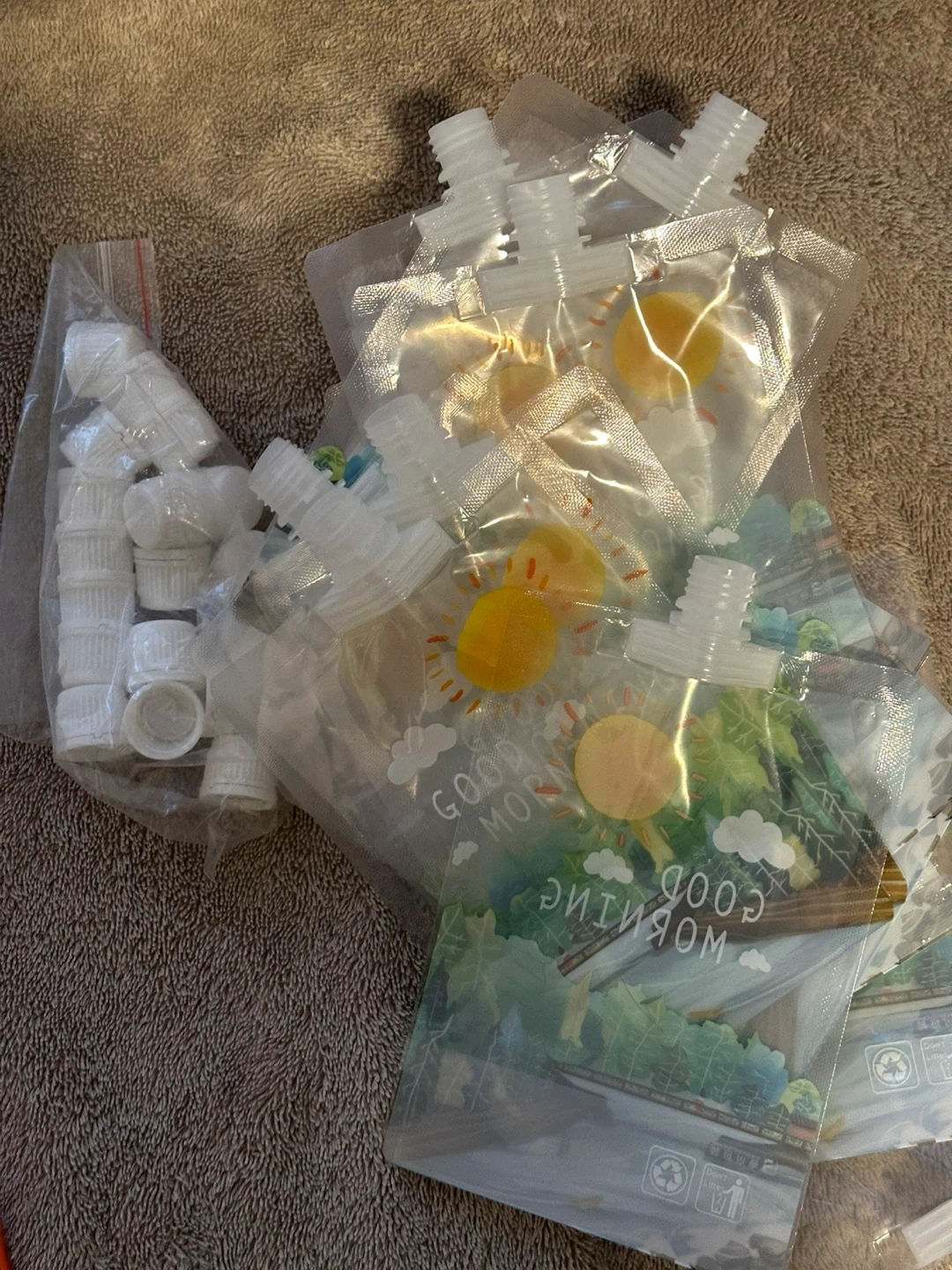 Set of reusable squeeze pouches with screw-on caps. They're great for on-the-go snacks or purees. Pouches feature a 'Good Morning' design. Approximately 15 pouches and 15 caps shown.
