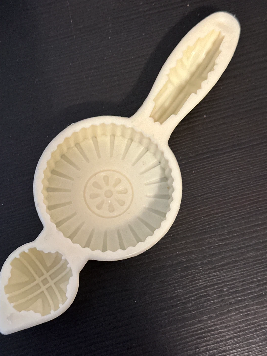 This is a vintage dessert mold, perfect for creating decorative pastries or candies. It features a flower and ridged design for intricate shaping. Its unique handle makes it easy to use for all your baking projects!