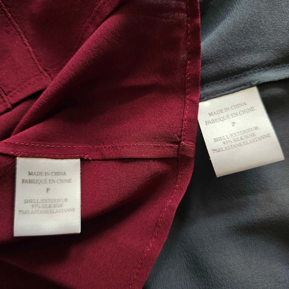 The silk material is in fantastic shape with no marks or damage. Some buttons have slight chipping of the coloring around the edges, moreso on the wine blouse than the grey one. Please see last photos for detail of the most chipped buttons.