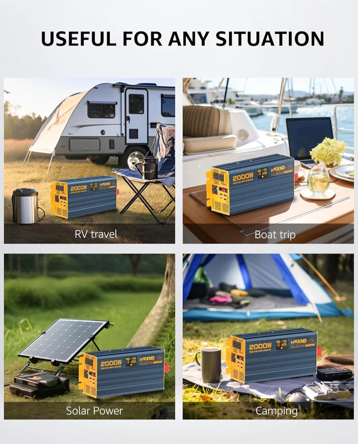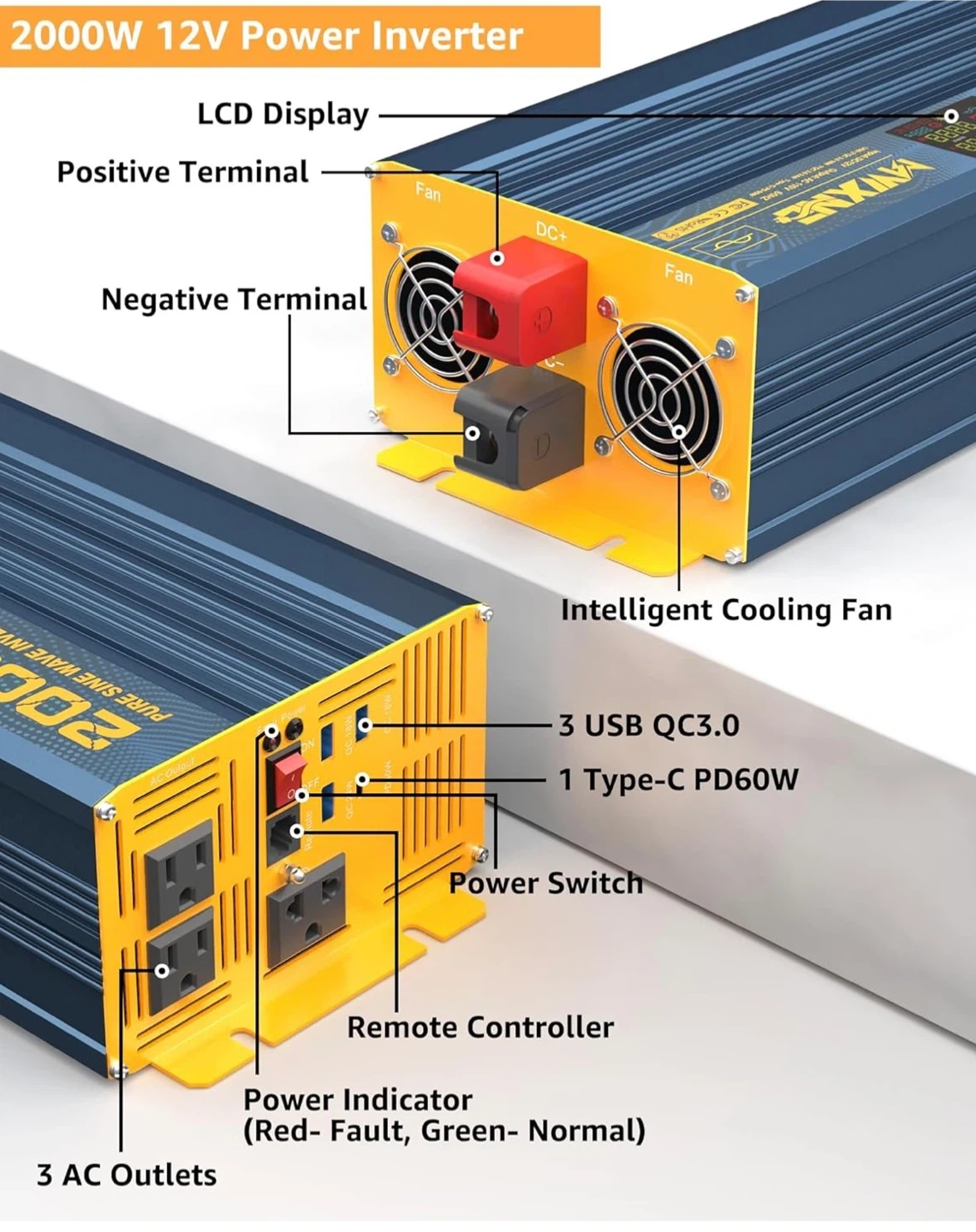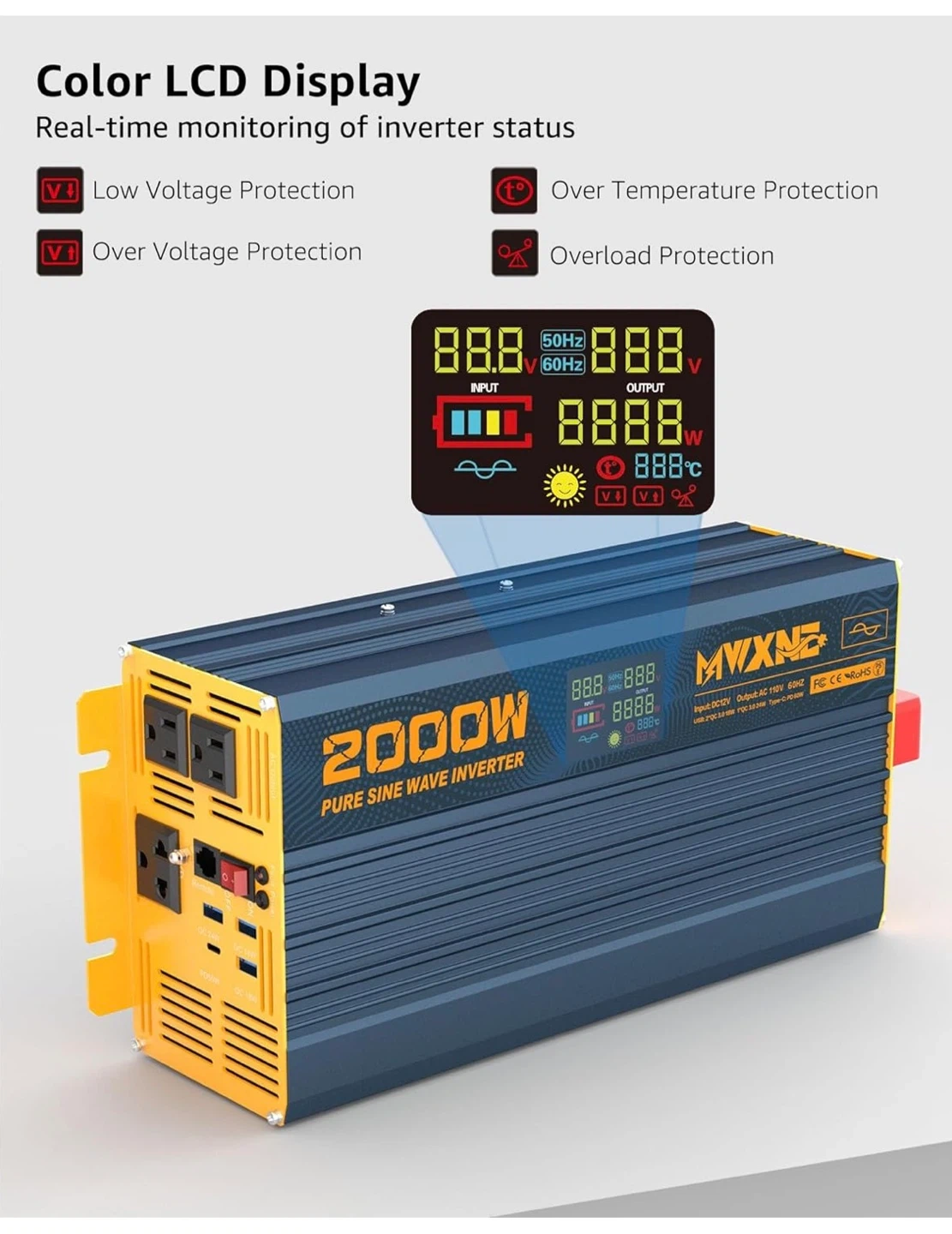 This 2000W pure sine wave inverter is ideal for powering electronics. It features a clear LCD display for real-time monitoring and multiple output ports, including AC, USB QC3.0, and Type-C PD60W. Includes wired and wireless remote controls for convenience. Protects against low/over voltage, over temperature, and overload.