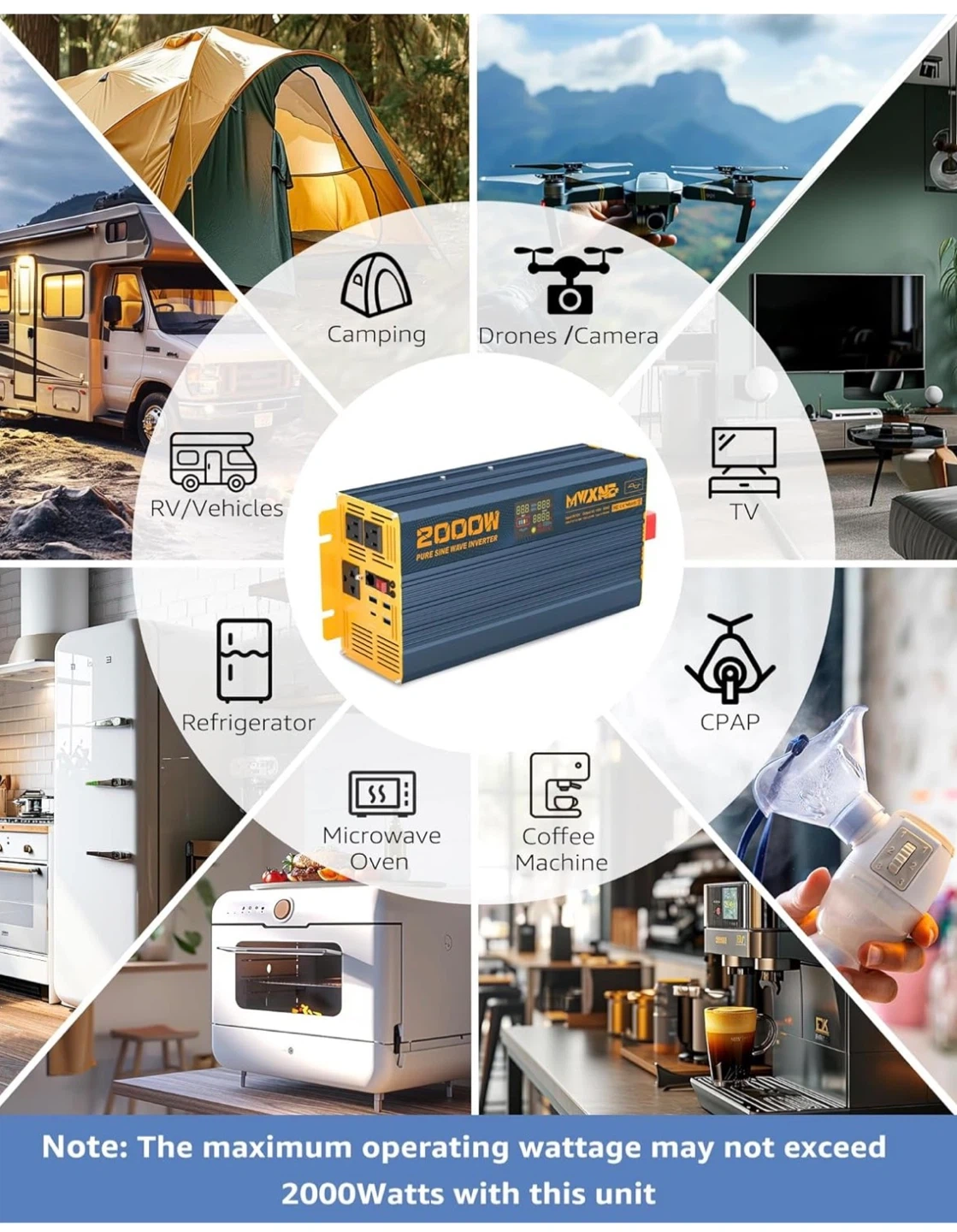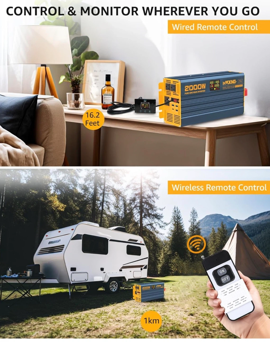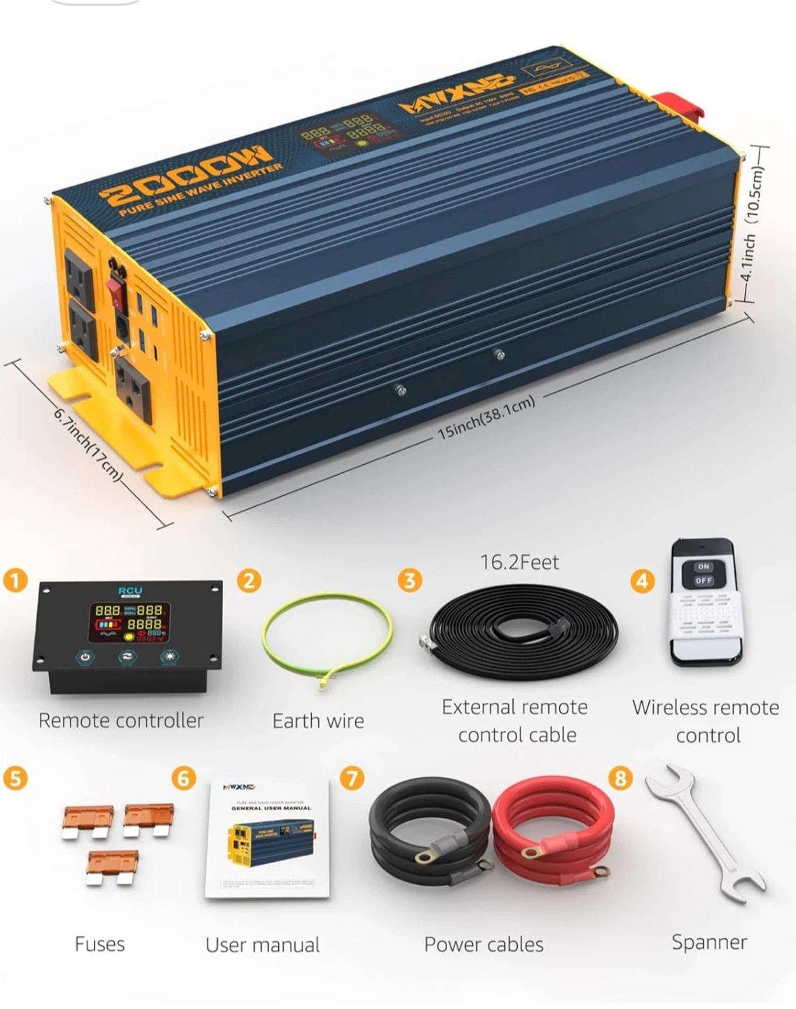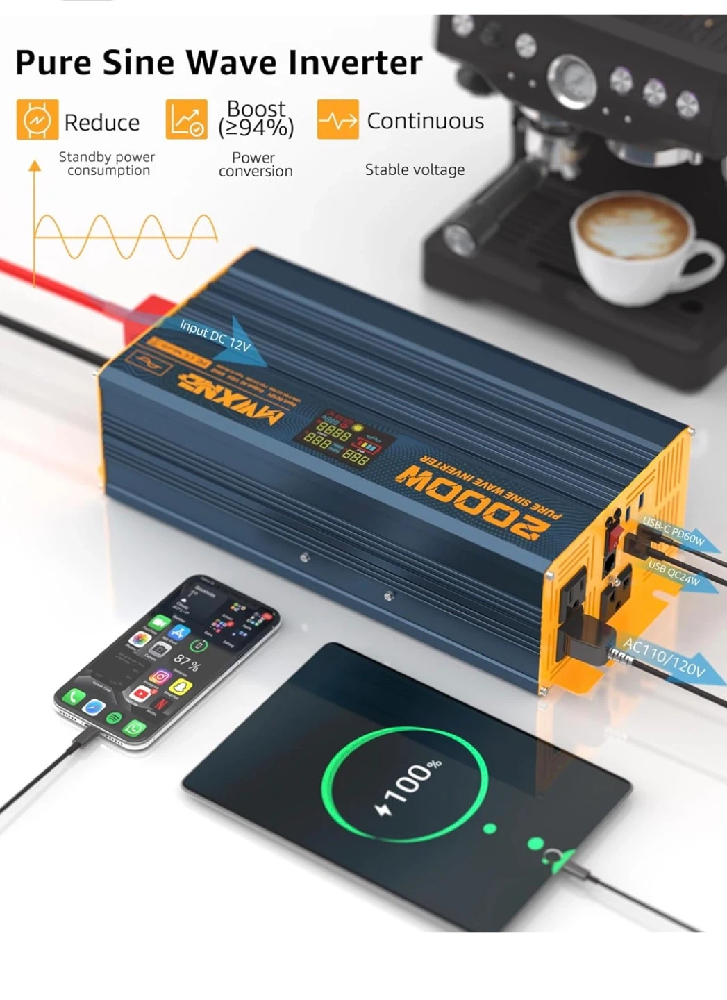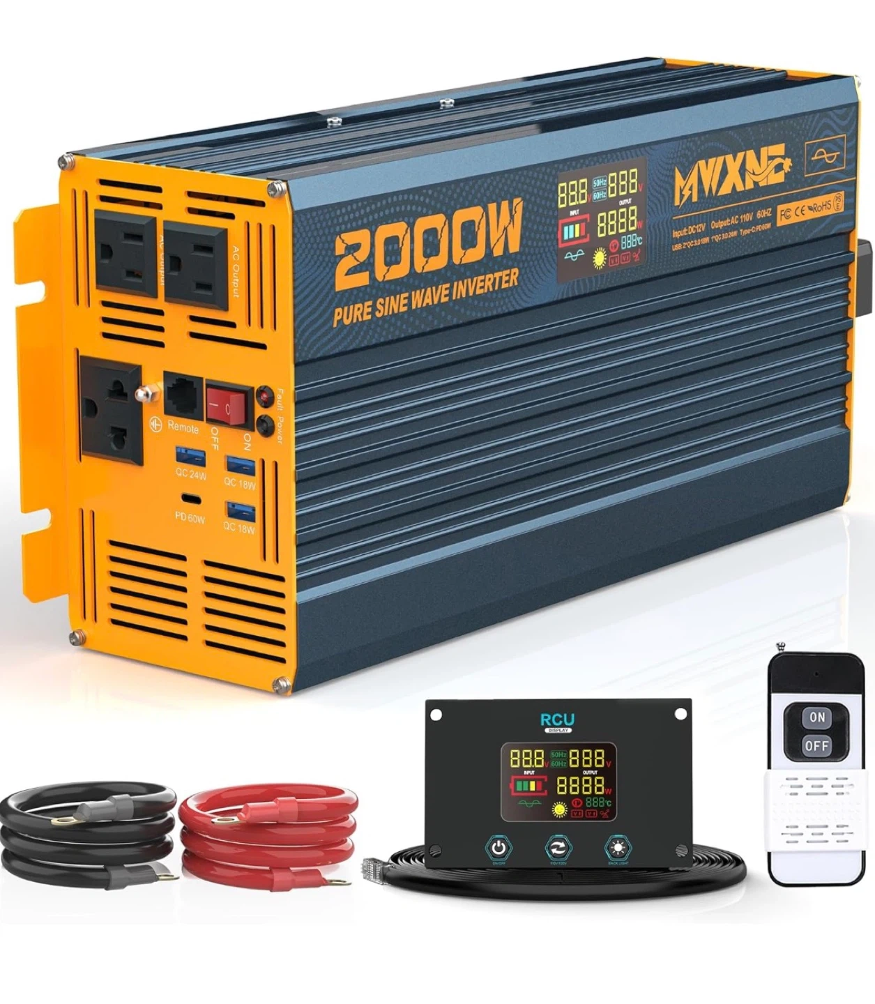 This 2000W pure sine wave inverter is ideal for powering electronics. It features a clear LCD display for real-time monitoring and multiple output ports, including AC, USB QC3.0, and Type-C PD60W. Includes wired and wireless remote controls for convenience. Protects against low/over voltage, over temperature, and overload.