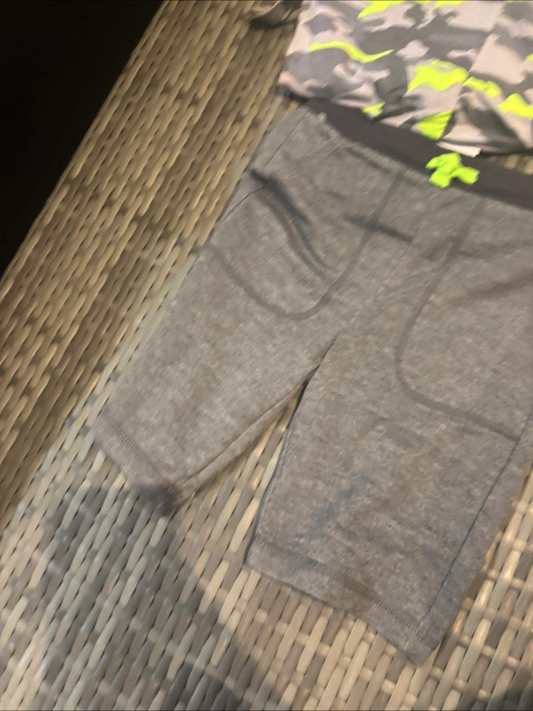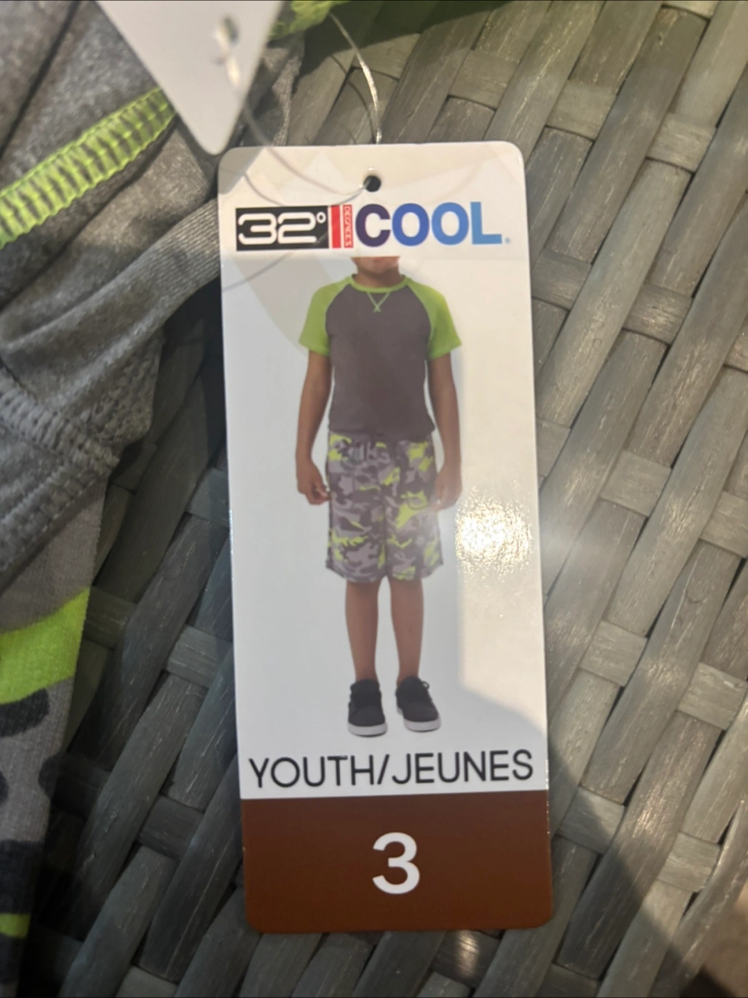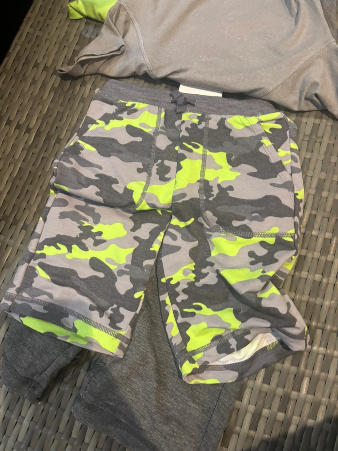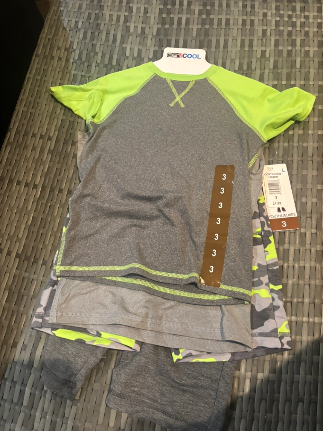 This 32 Degrees Cool set includes a grey t-shirt with neon green sleeves and a pair of grey camouflage shorts. It's made for active wear. The set is size 3.