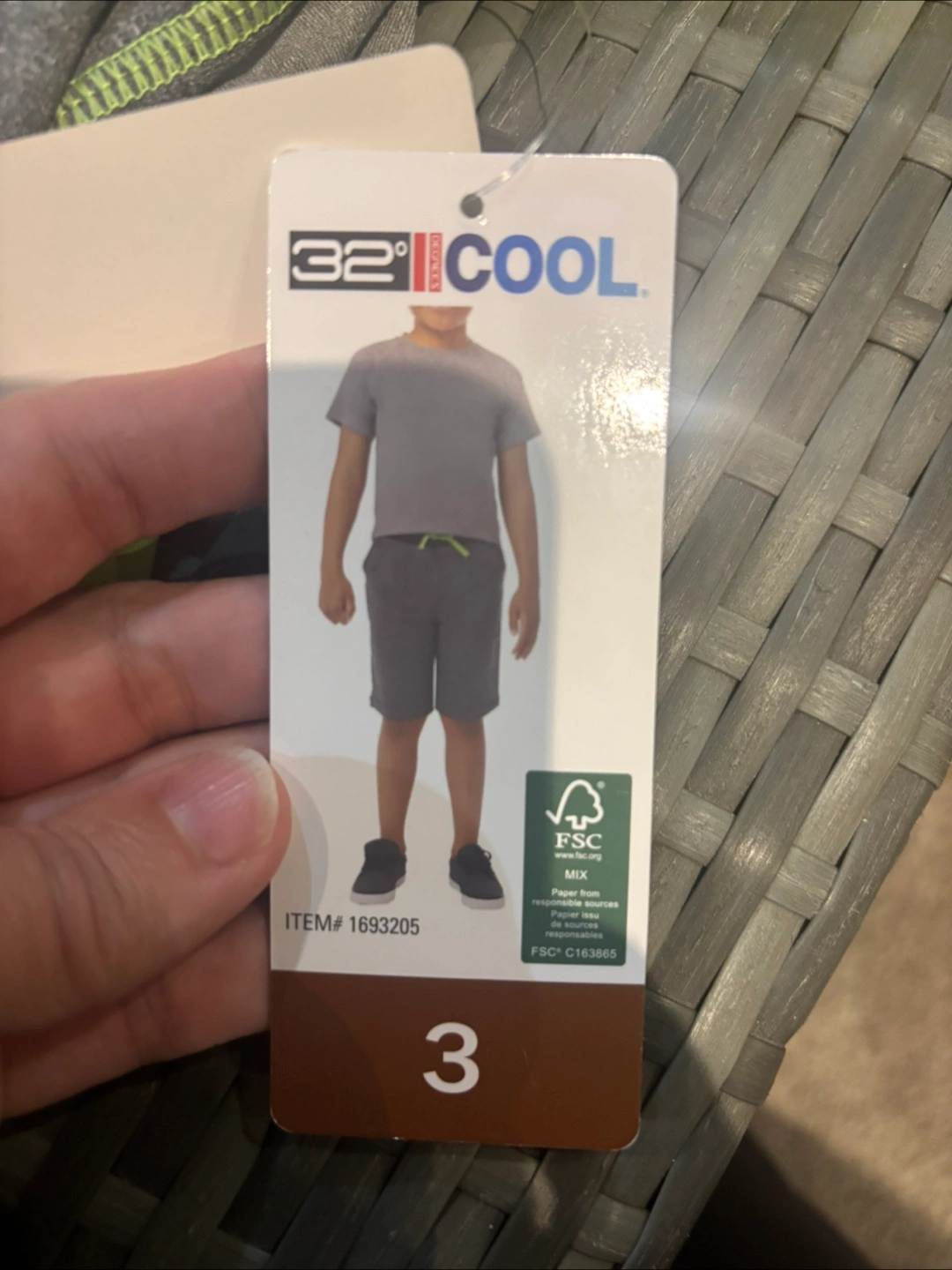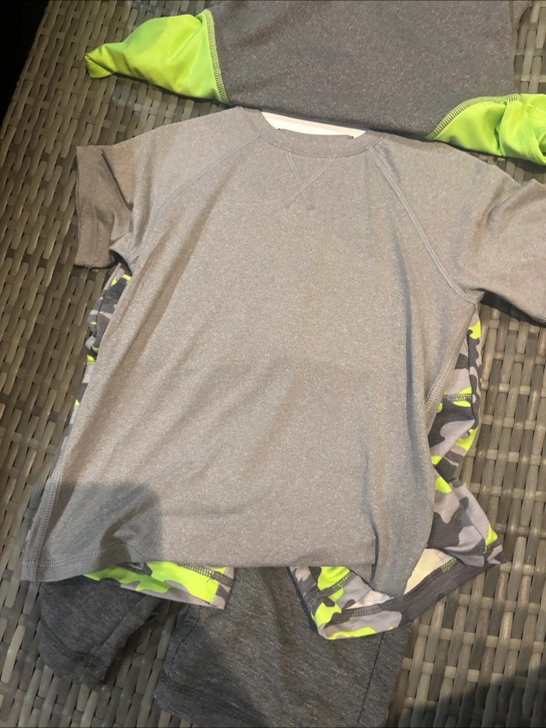 This 32 Degrees Cool set includes a grey t-shirt with neon green sleeves and a pair of grey camouflage shorts. It's made for active wear. The set is size 3.