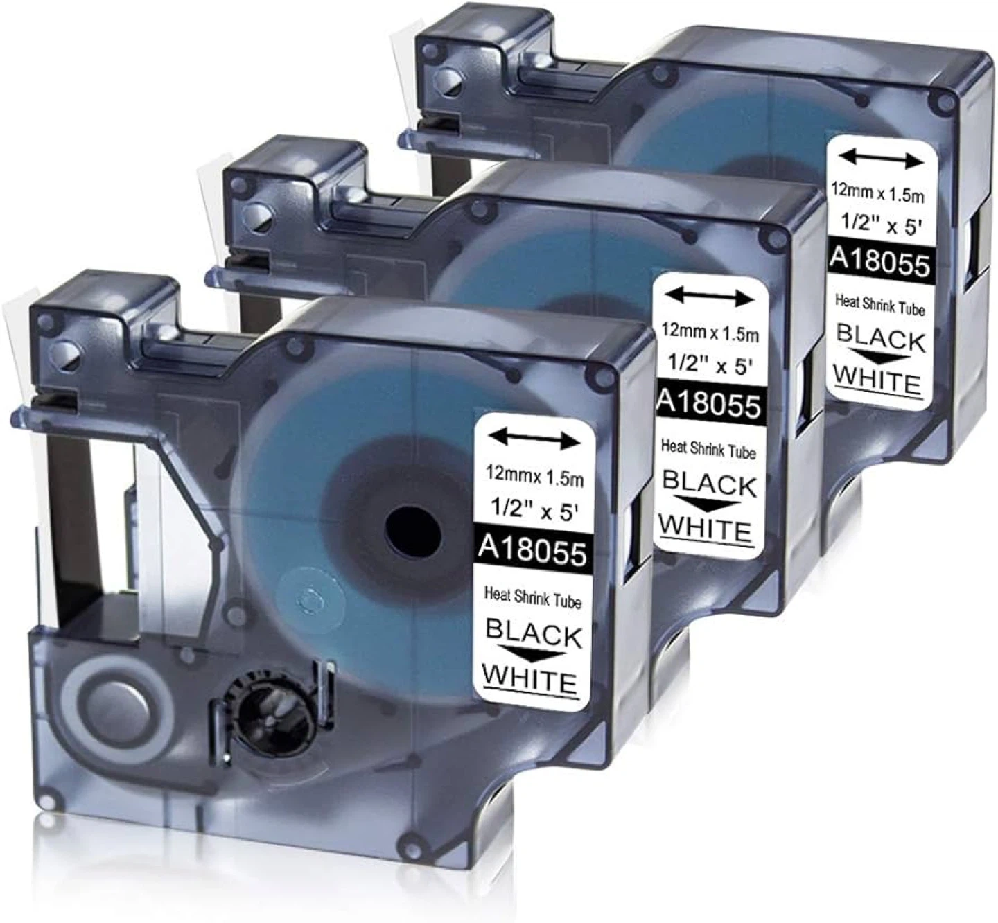 Three rolls of DYMO A18055 heat shrink tube label tape. Each roll is 12mm wide and 1.5m (5 ft) long, designed for wrapping wire and cable. Tape is black on white.