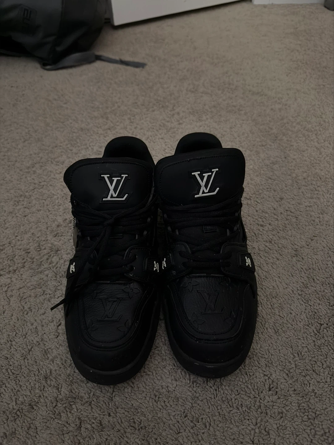 Black Louis Vuitton sneakers with monogram pattern. These stylish kicks are made of leather and feature the iconic LV logo. They're perfect for adding a touch of luxury to any outfit. Accepting cash offers no low balls