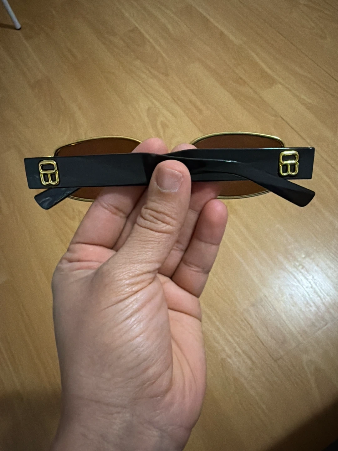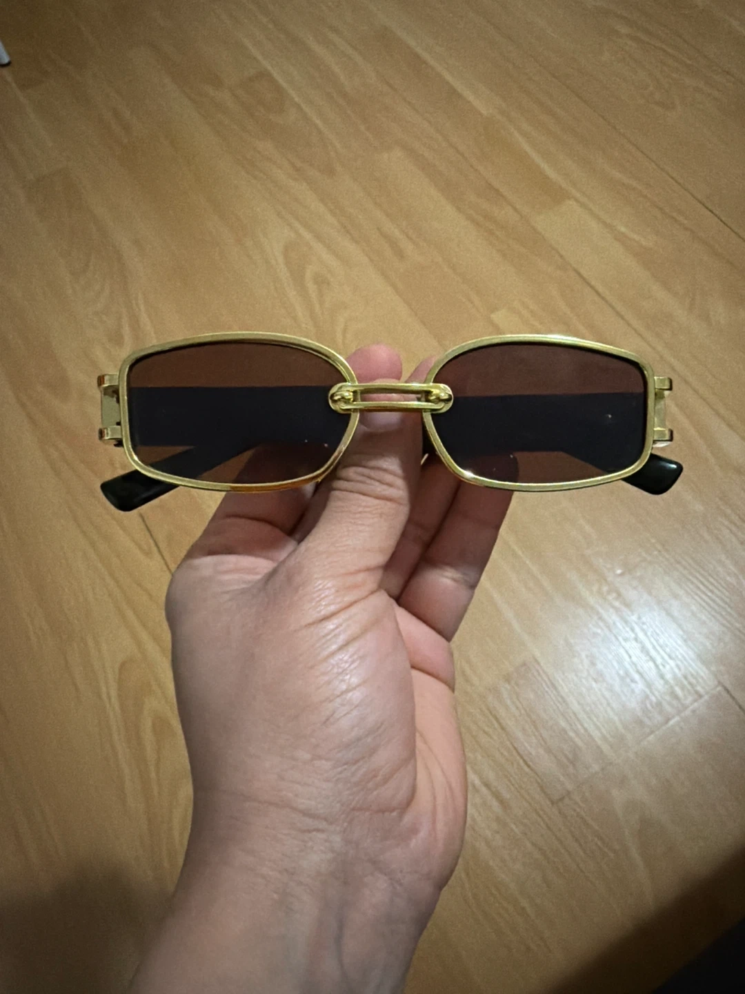 Stylish square sunglasses with gold frames and black arms. They feature brown tinted lenses and a gold logo detail on the arms. Great for sun protection and a fashion statement!