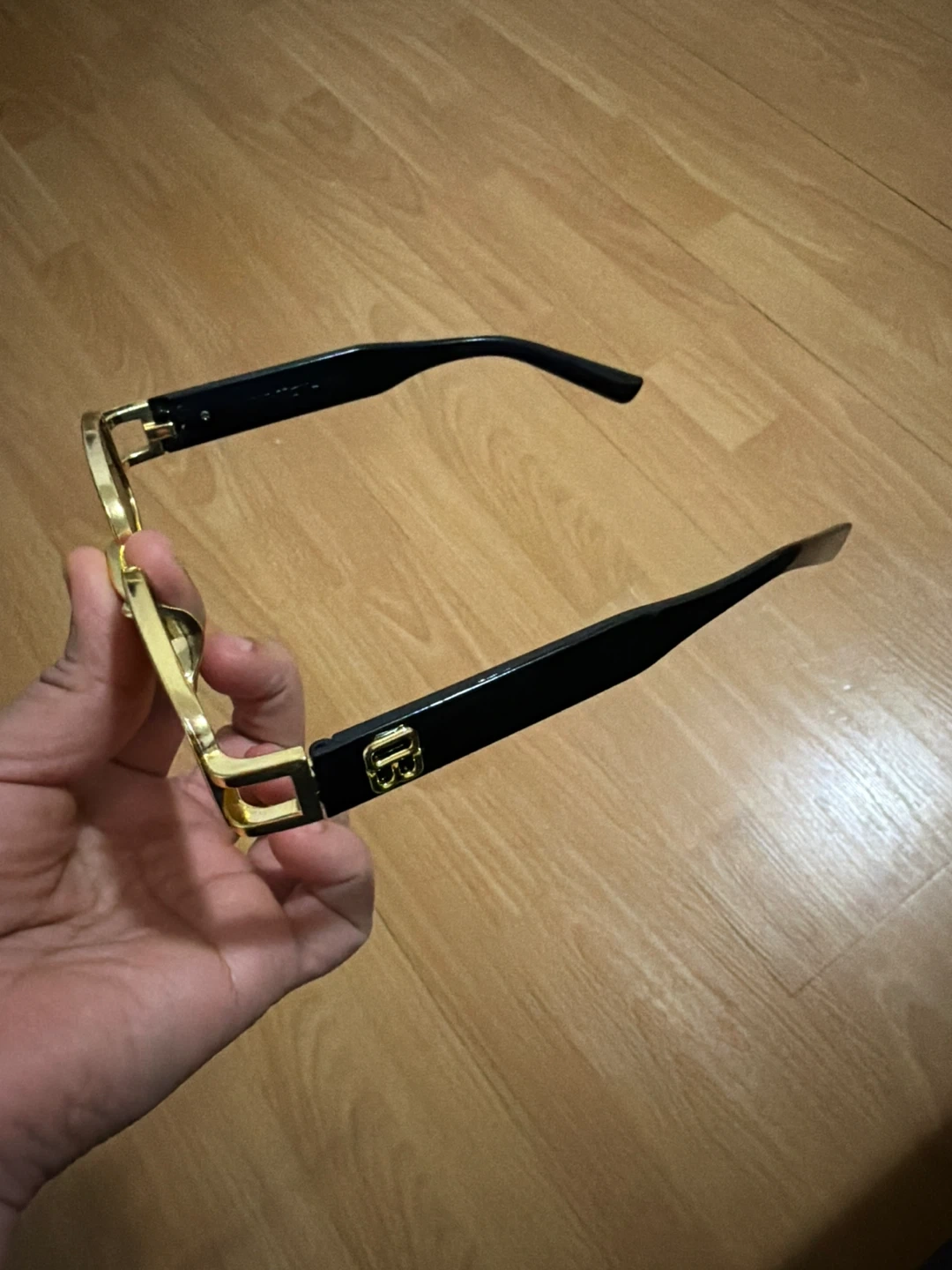 Stylish square sunglasses with gold frames and black arms. They feature brown tinted lenses and a gold logo detail on the arms. Great for sun protection and a fashion statement!