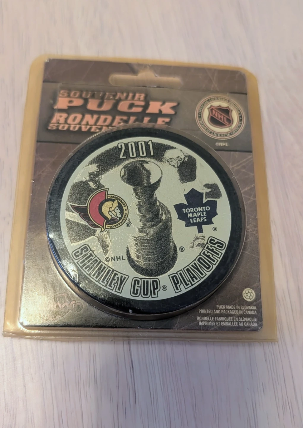 NHL souvenir puck commemorating the 2001 Stanley Cup Playoffs. It features the Ottawa Senators and Toronto Maple Leafs logos. Puck manufactured in Slovakia.