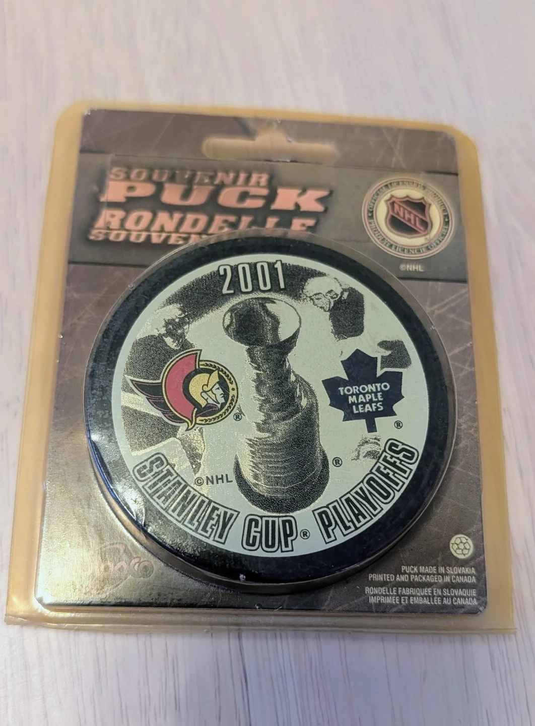NHL souvenir puck commemorating the 2001 Stanley Cup Playoffs. It features the Ottawa Senators and Toronto Maple Leafs logos. Puck manufactured in Slovakia.