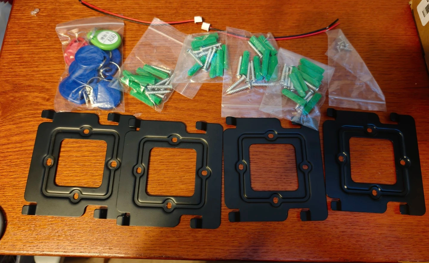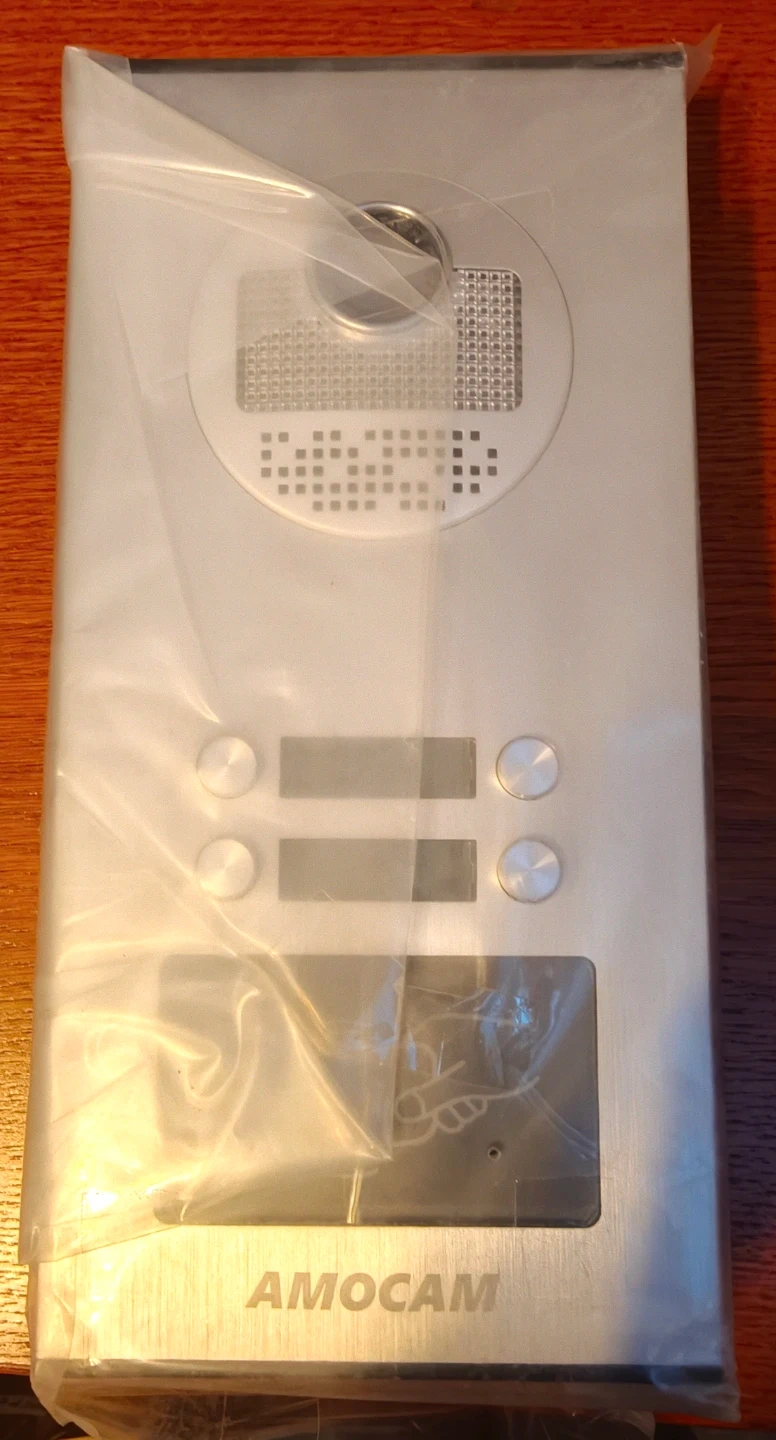 Brand new AMOCAM video intercom system. Includes outdoor unit, 4 indoor monitors, power adapters, mounting brackets, Ethernet cables, and RFID key fobs. Get yours today!