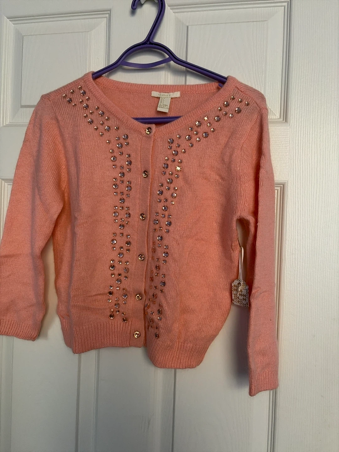 This is a pink cardigan from Forever 21. It's embellished with rhinestones and has button closures. The material is a soft knit.