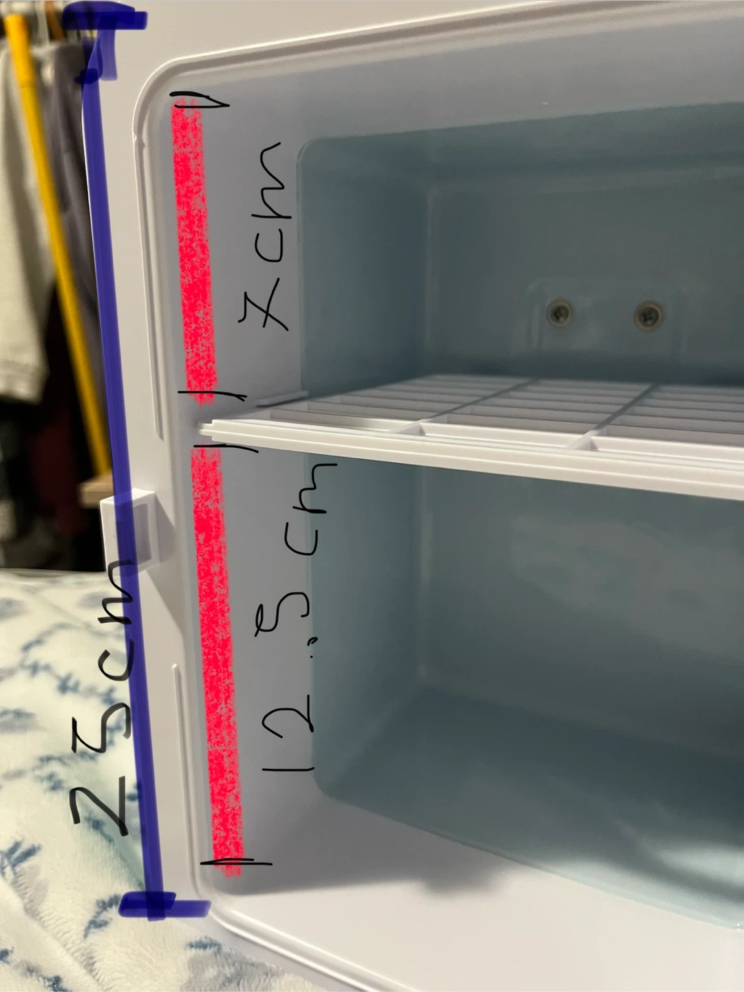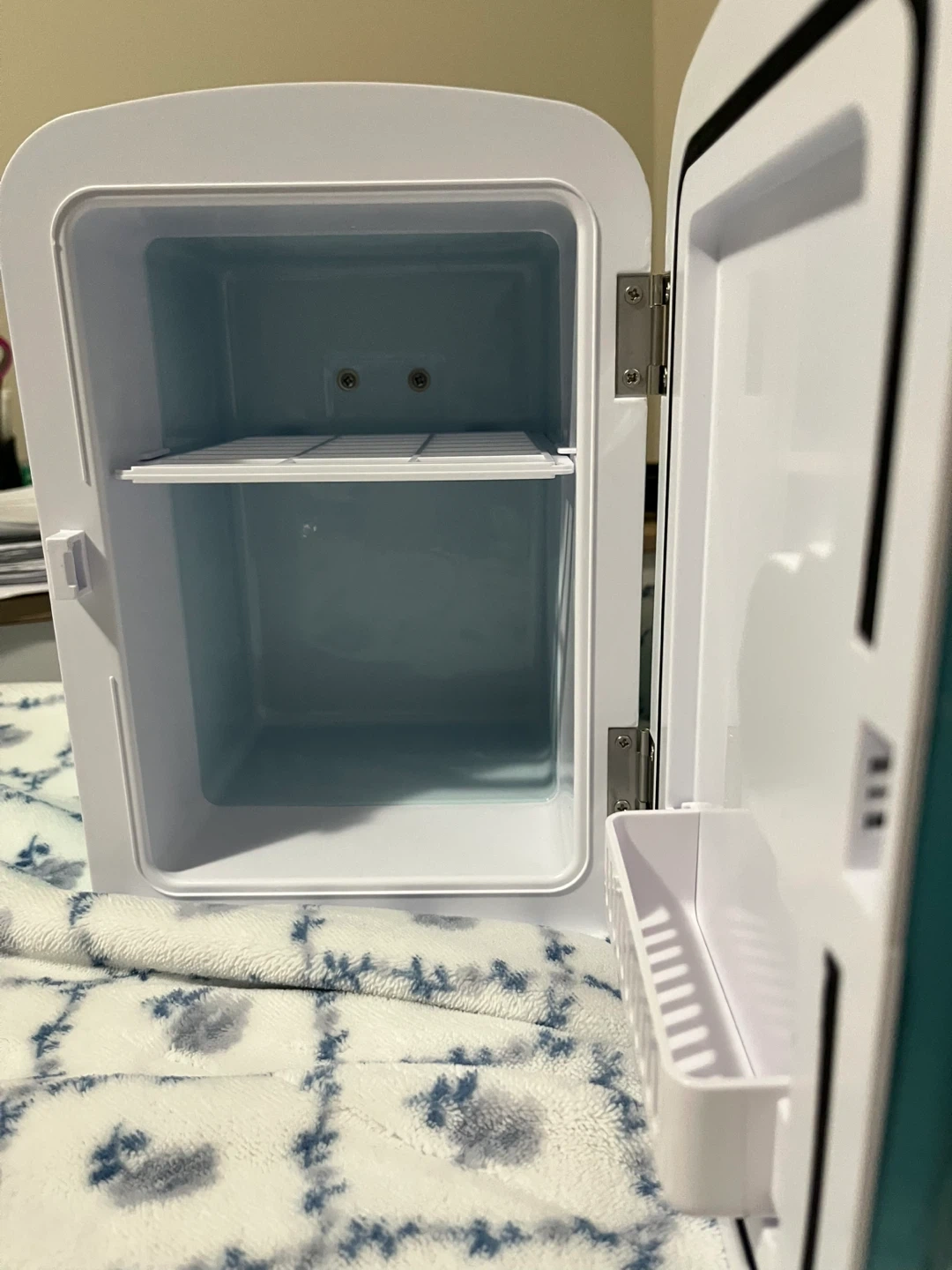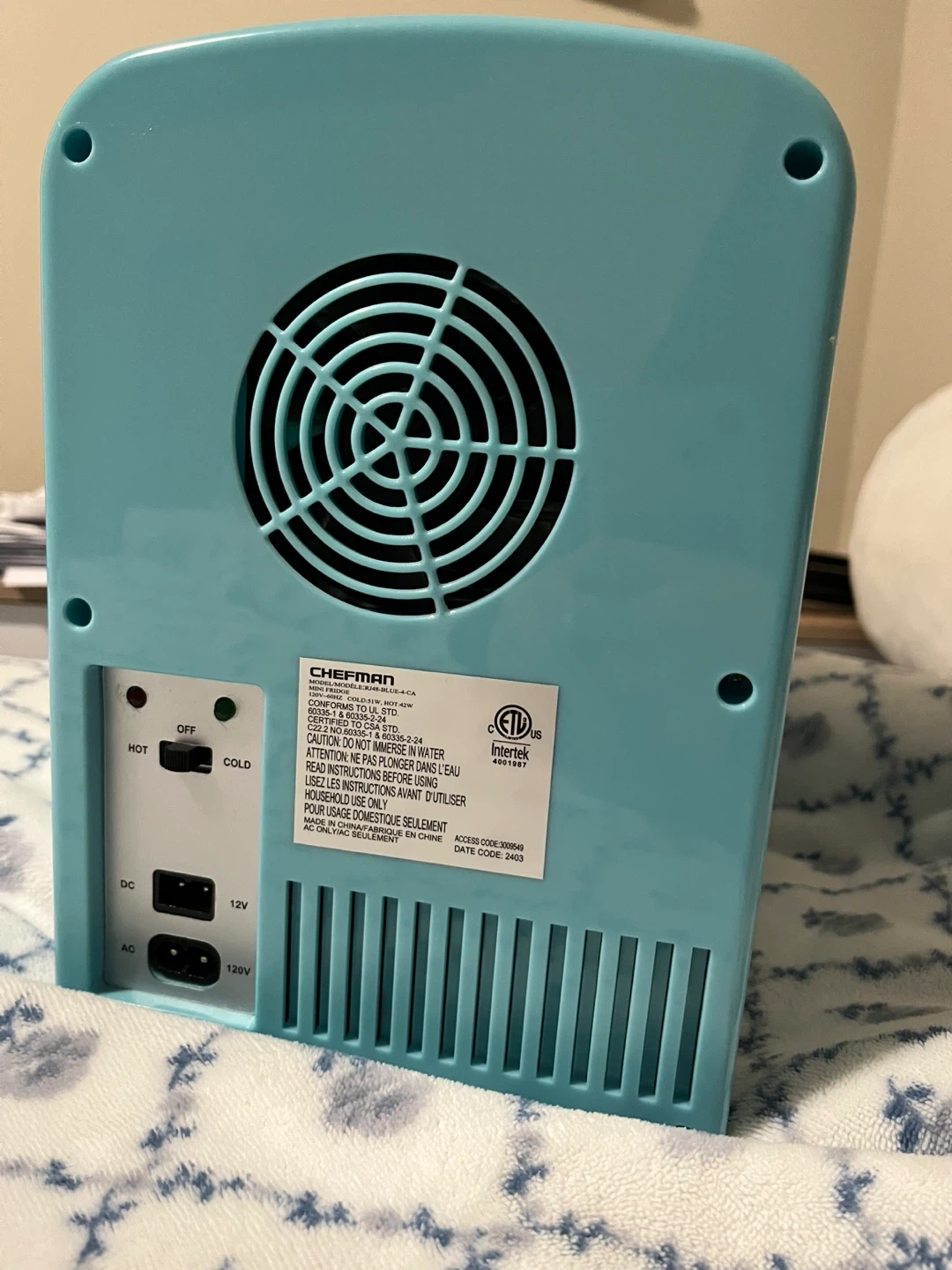 This is a cute, teal ICEMAN mini fridge! It's perfect for keeping drinks or snacks cool on a bedroom or office space. It has hot and cold settings. It's powered by a DC 12V adapter. Includes 9 piece 8oz reusable containers perfect to store water or juice. Carefully cared for perfect function I just stoped using it