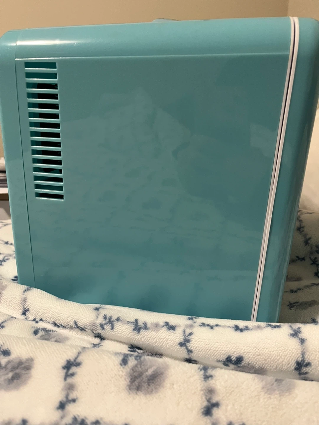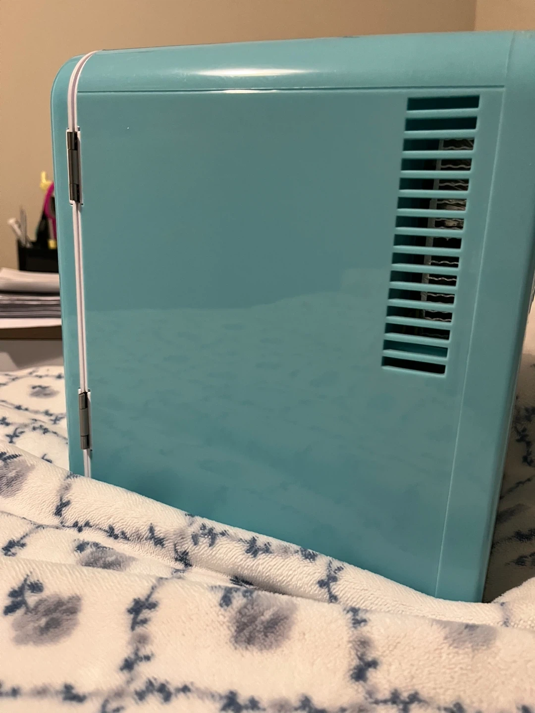 This is a cute, teal ICEMAN mini fridge! It's perfect for keeping drinks or snacks cool on a bedroom or office space. It has hot and cold settings. It's powered by a DC 12V adapter. Includes 9 piece 8oz reusable containers perfect to store water or juice. Carefully cared for perfect function I just stoped using it