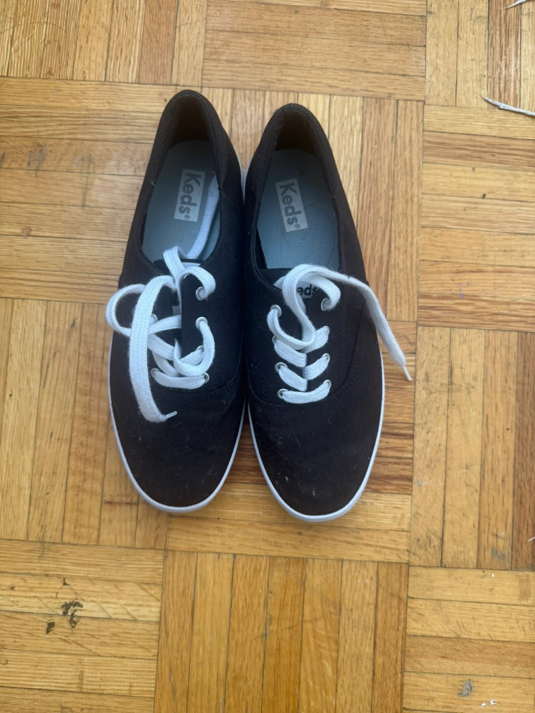 Classic black canvas sneakers from Keds. These low-top shoes feature white laces and a durable rubber sole. Perfect for everyday wear.