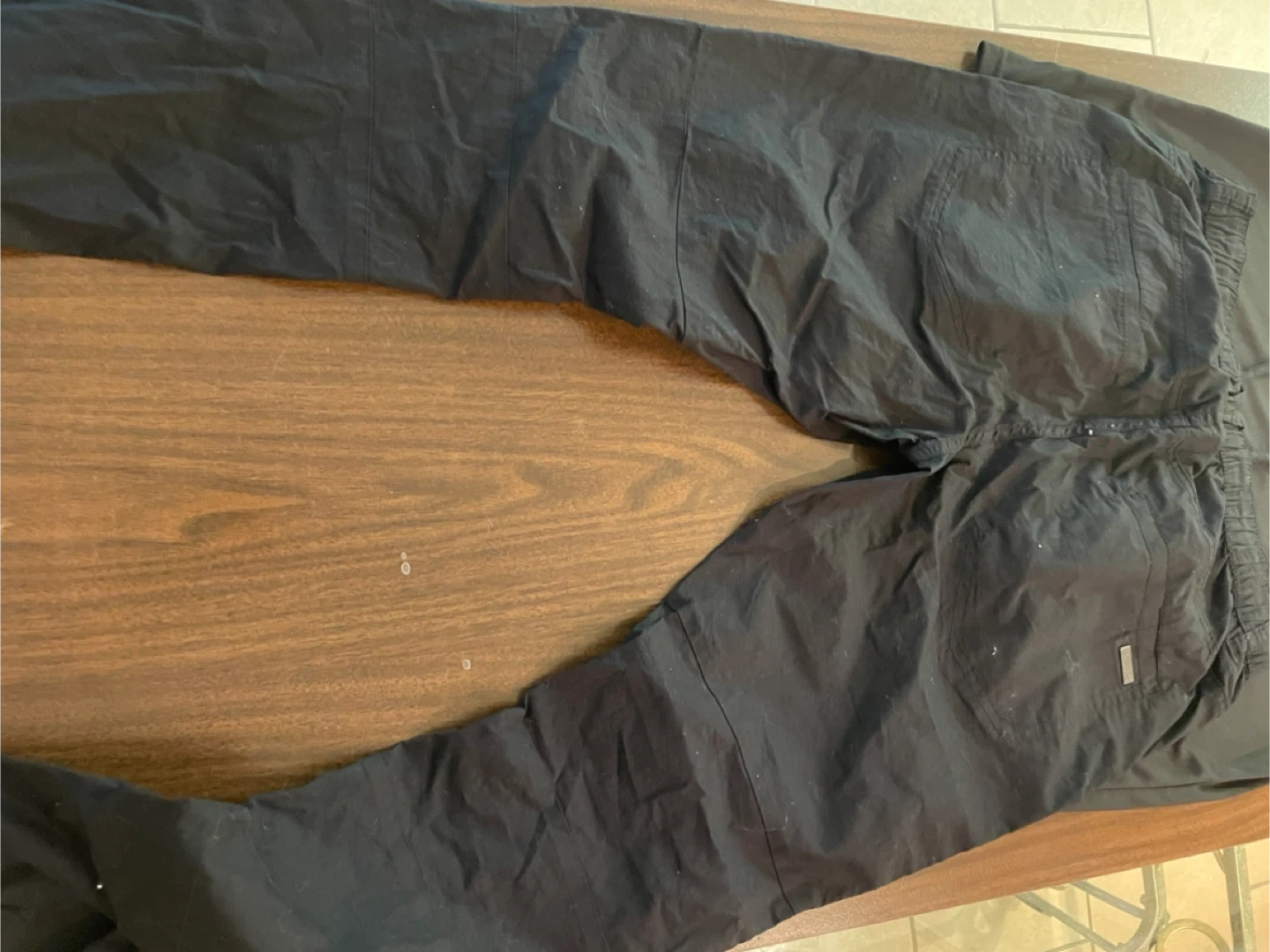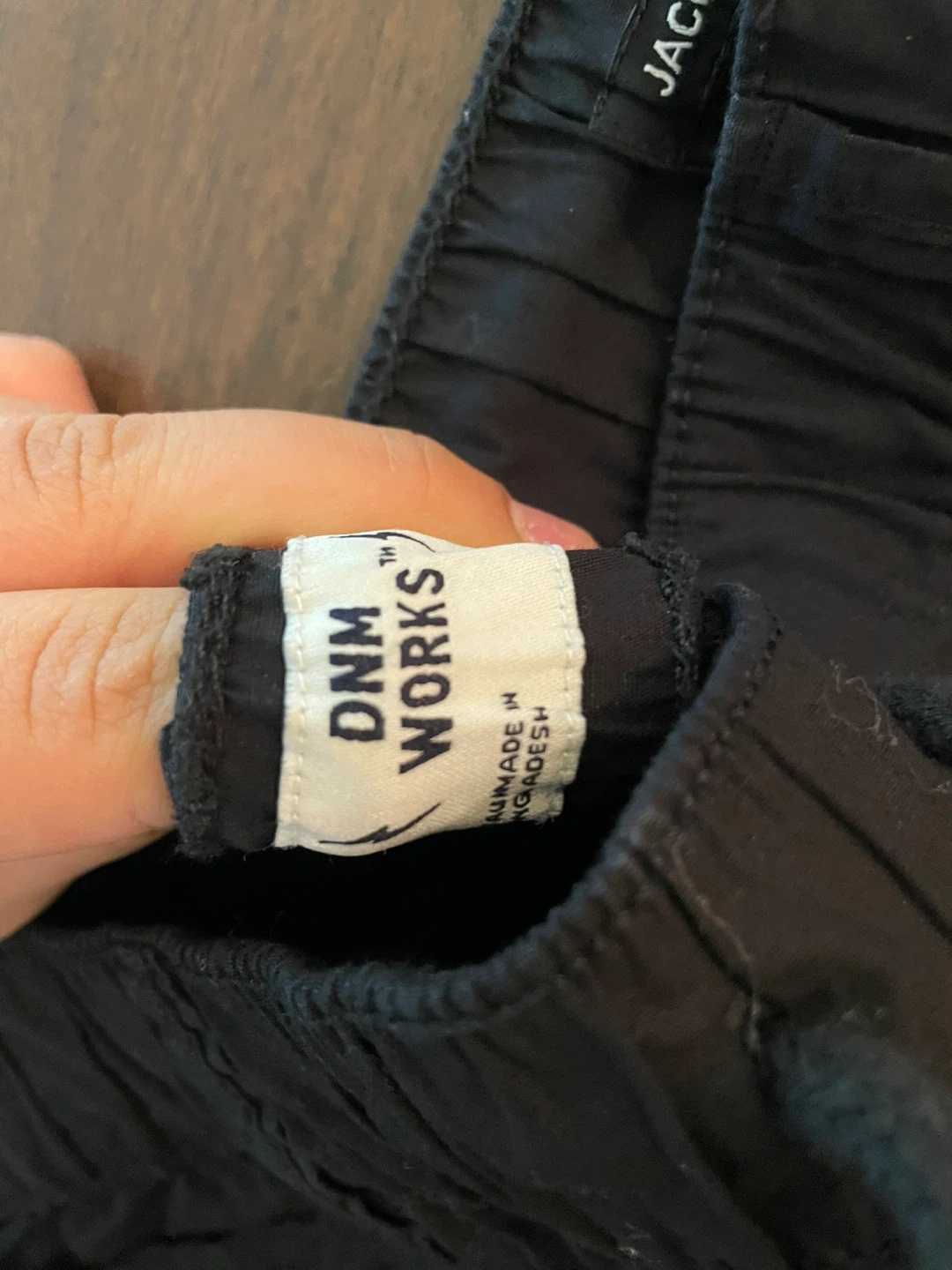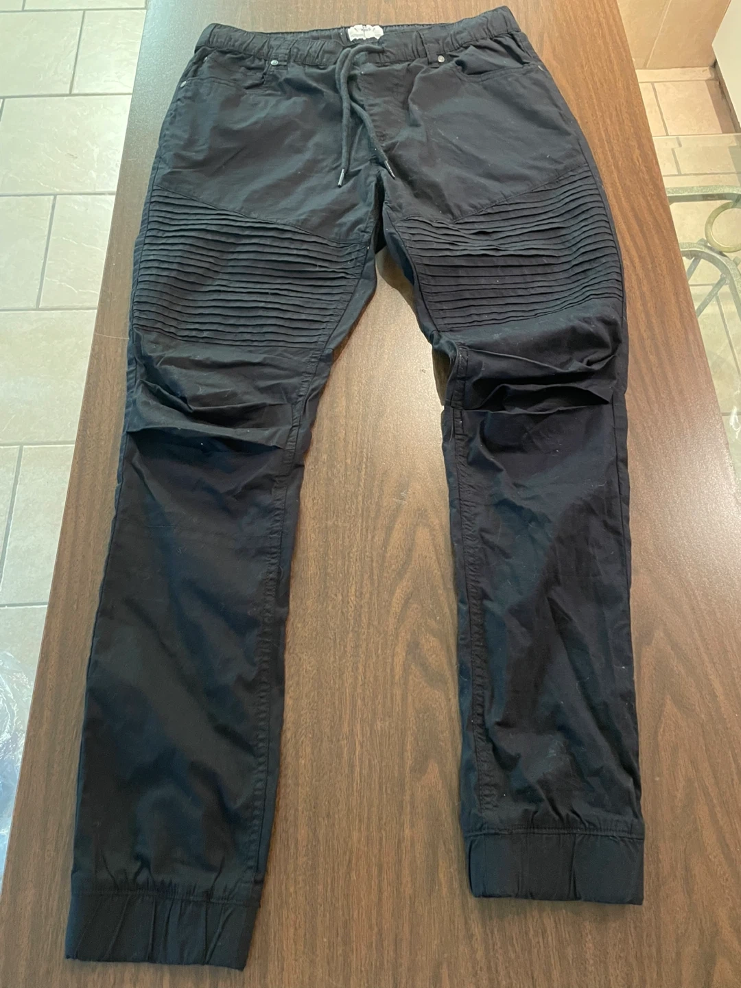 These black Jeanologie jogger pants are size medium, fitting a 32 waist. They're made from 98% cotton and 2% spandex. They feature a drawstring waist and moto-style ribbed detailing on the thighs. These pants are great for casual wear.