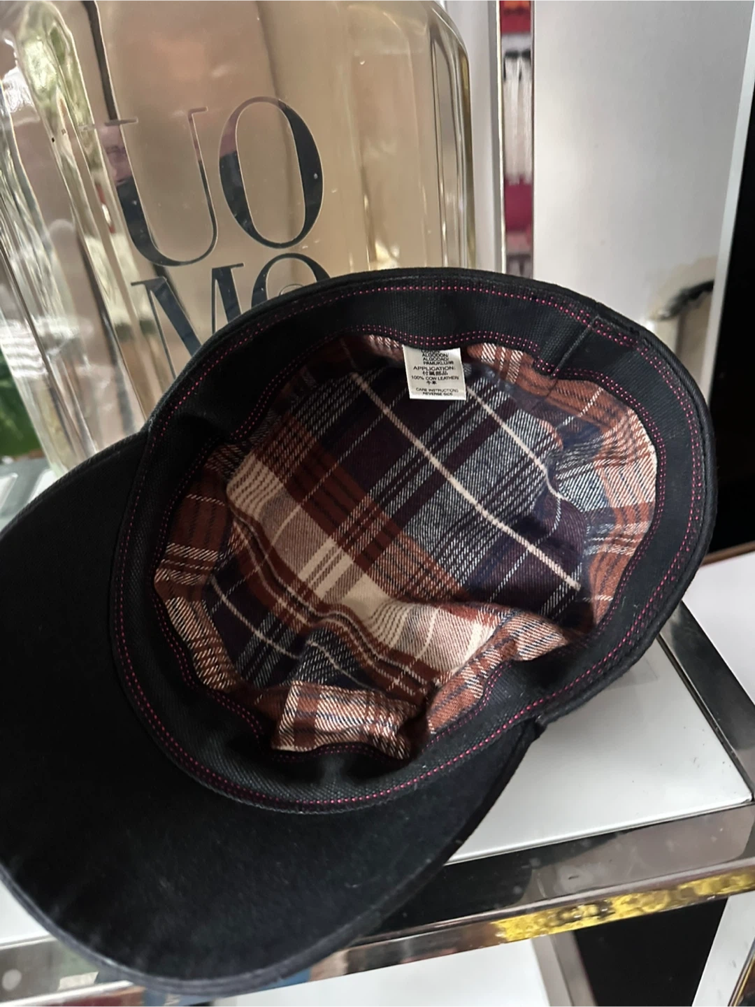 It has a plaid lining inside. The cap's material is a durable cotton blend.