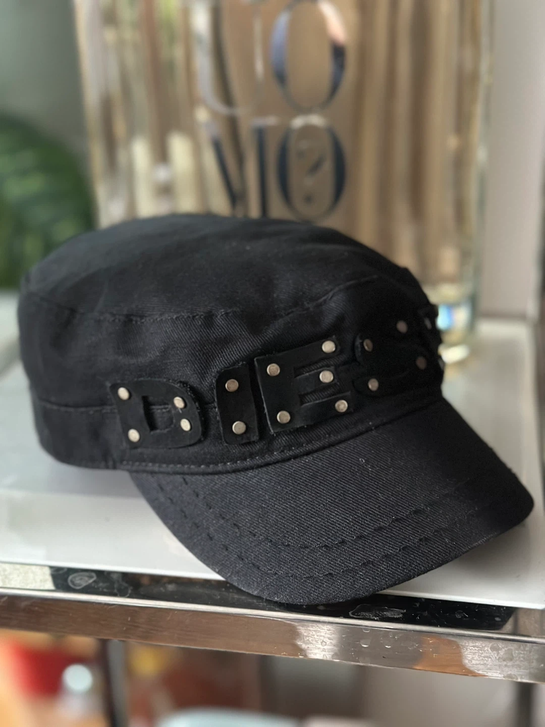This cool hip Diesel black military-style cap features decorative studs along the Leather Diesel Logo band.