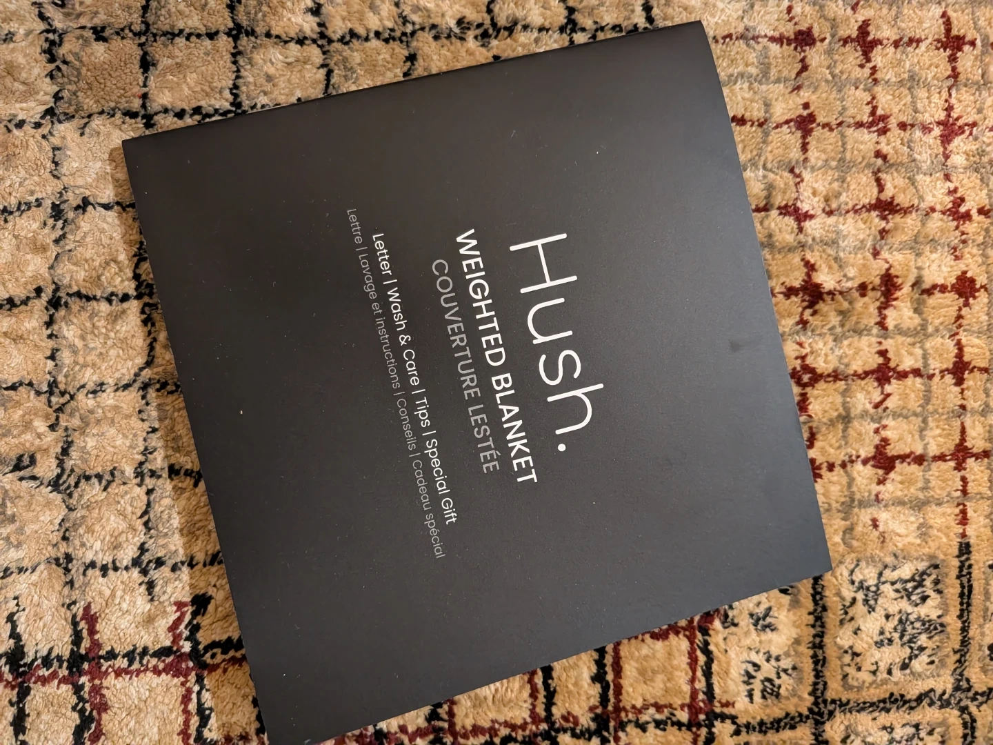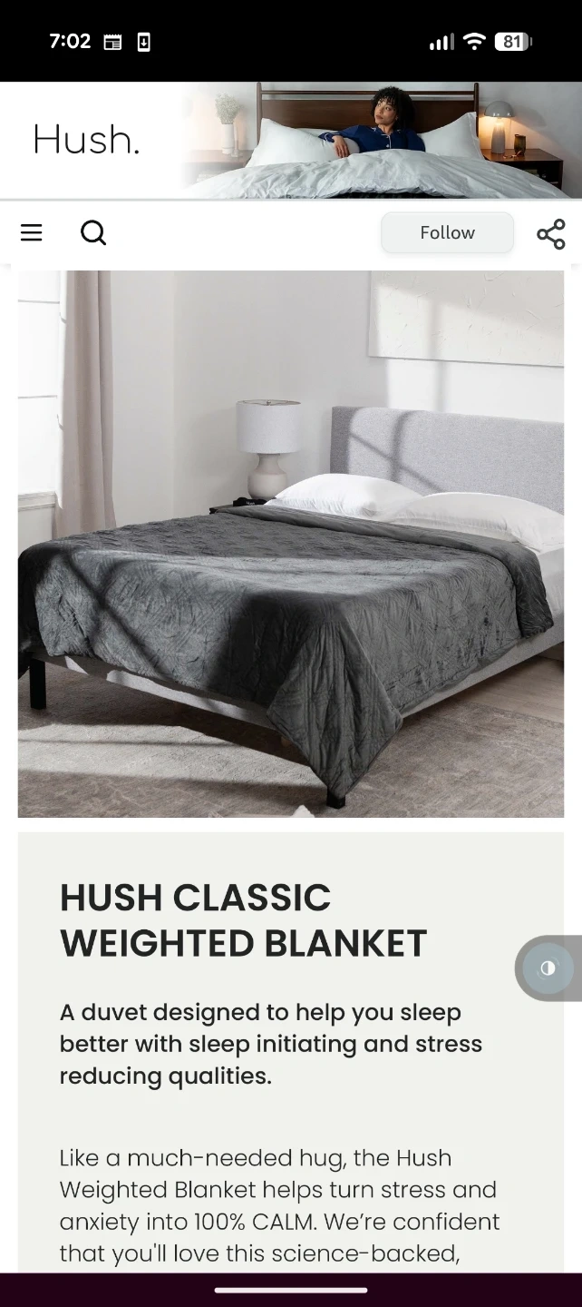 This is a Hush Classic Weighted Blanket. It's designed to help you sleep better by initiating sleep and reducing stress. The blanket provides a much-needed hug for 100% calm.
