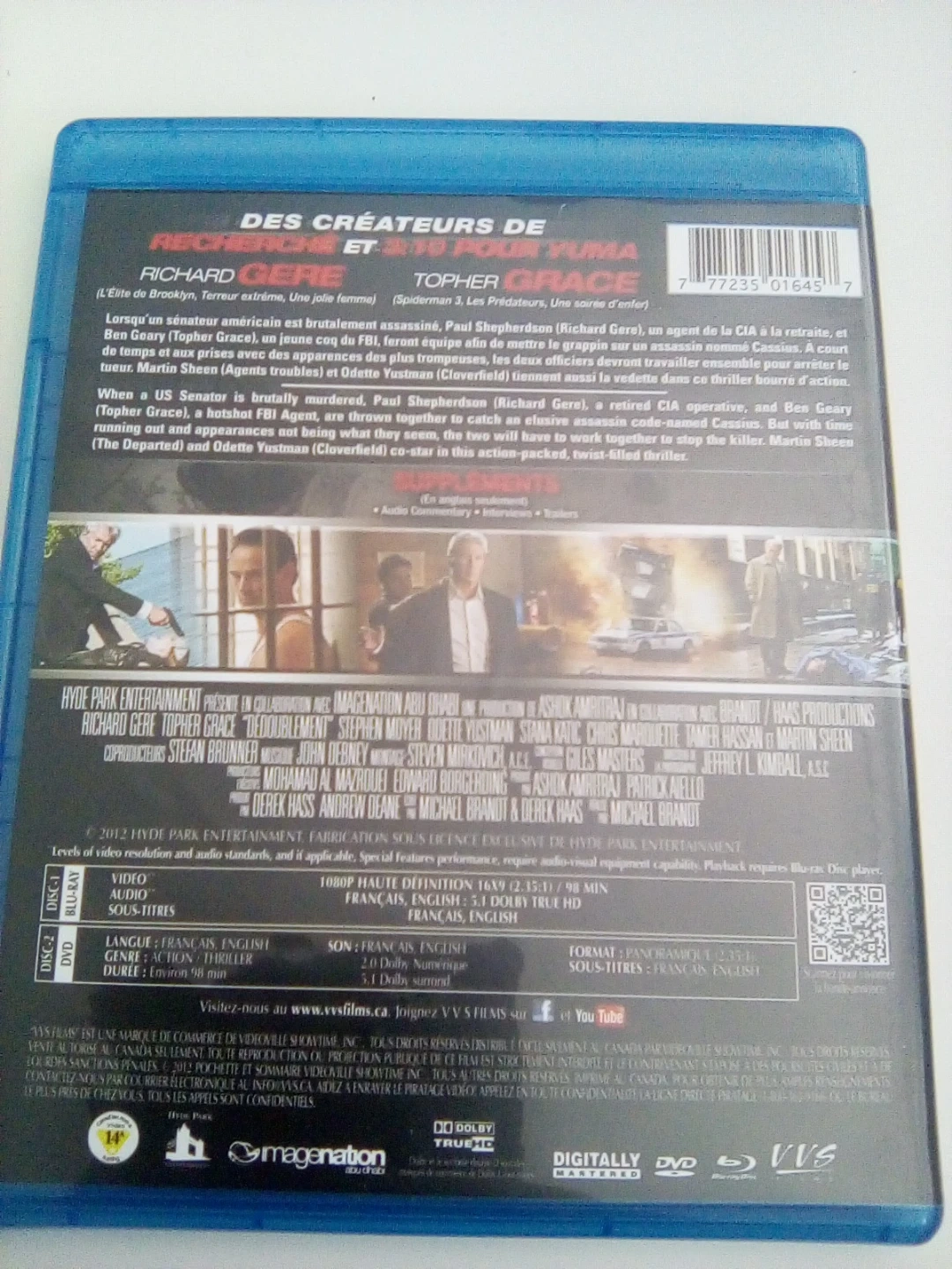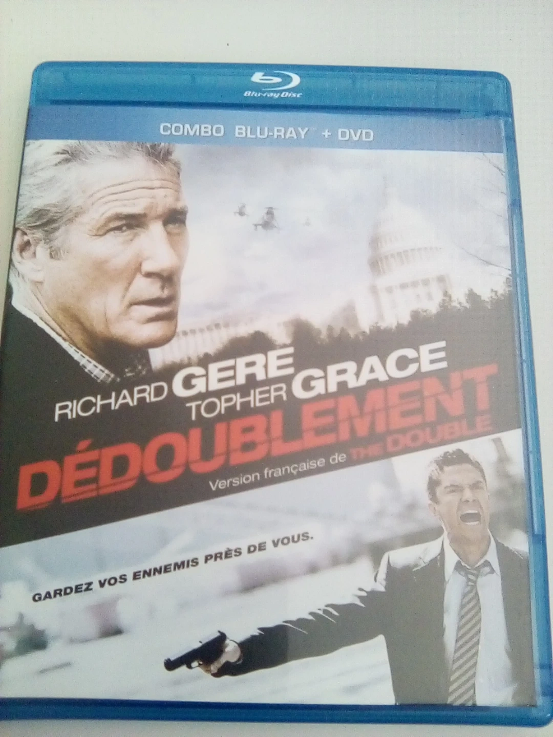 This is the Blu-ray and DVD combo pack for the movie The Double, starring Richard Gere and Topher Grace. It includes special features like audio commentary, interviews, and trailers. Language options are French and English.