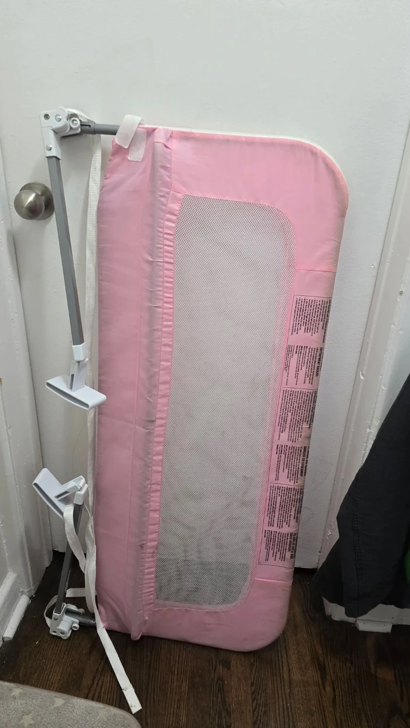 This is a pink mesh crib rail cover, designed to protect your crib and your baby. It features a breathable mesh panel for ventilation. Straps secure it to the crib.