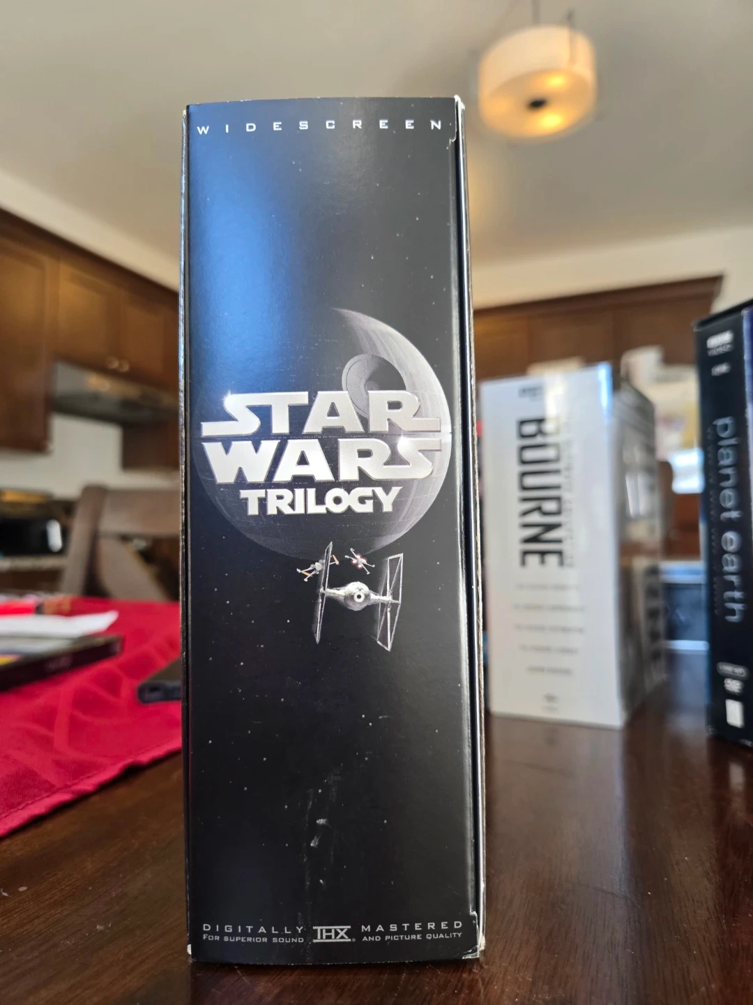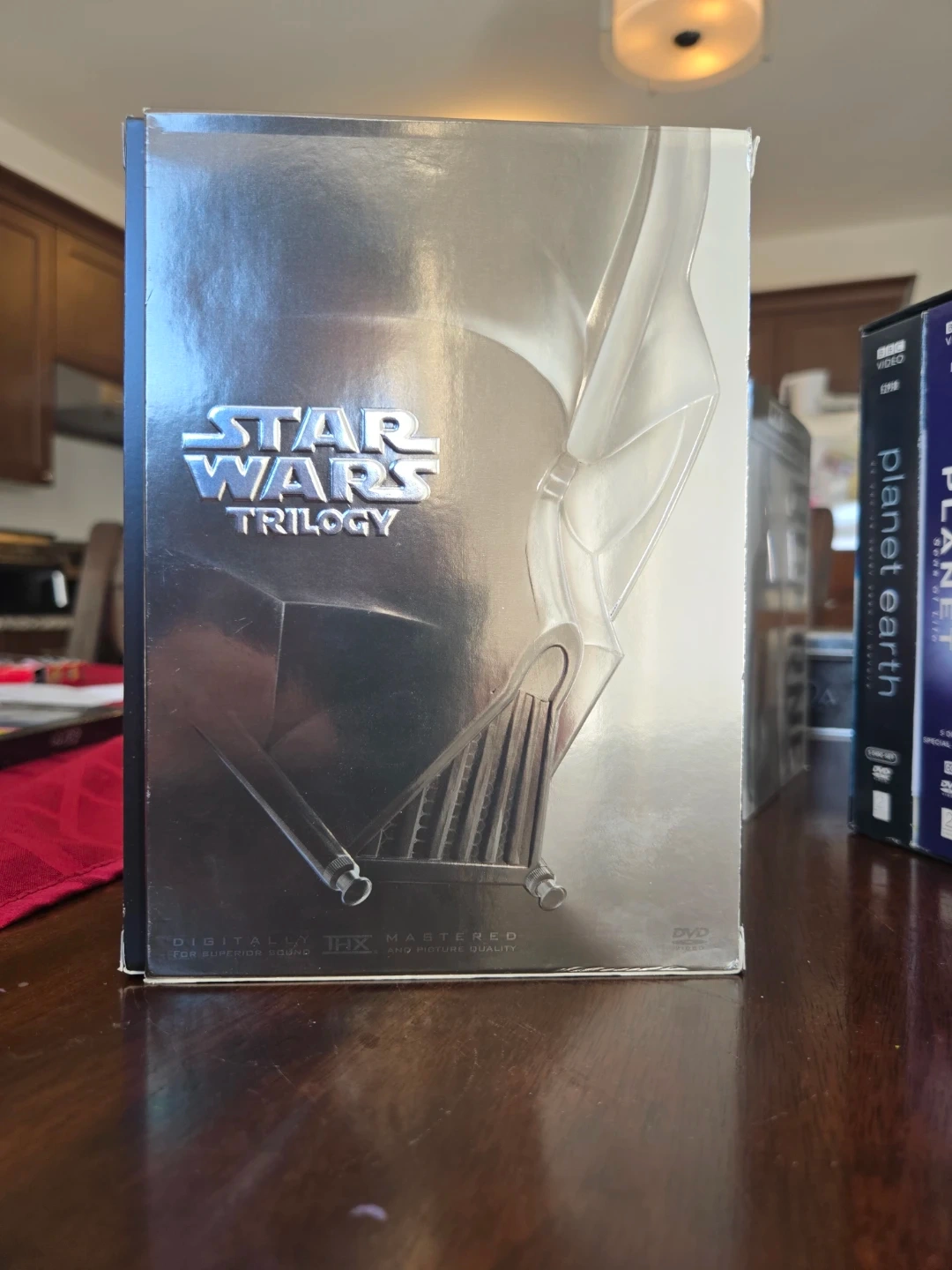 This is the Star Wars Trilogy DVD box set, including Episodes IV, V, and VI. It features widescreen format and THX certified mastering for superior sound and picture quality. A bonus material disc is also included in this collection.