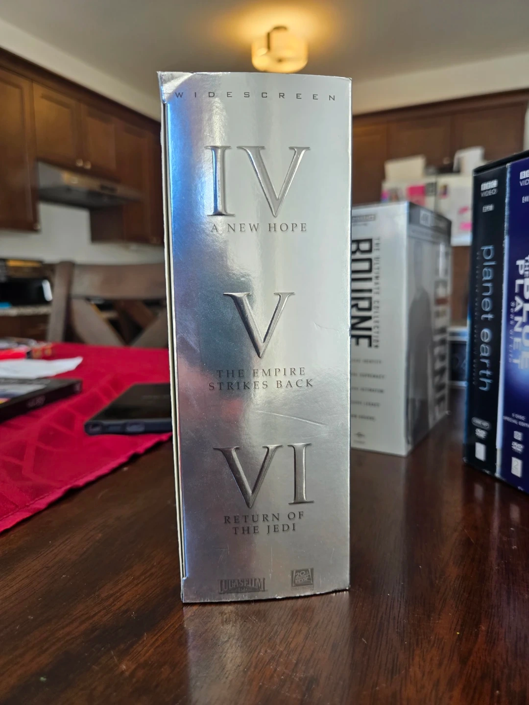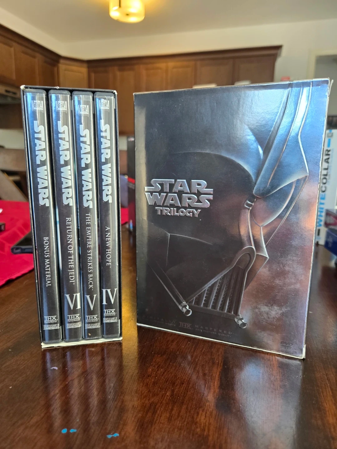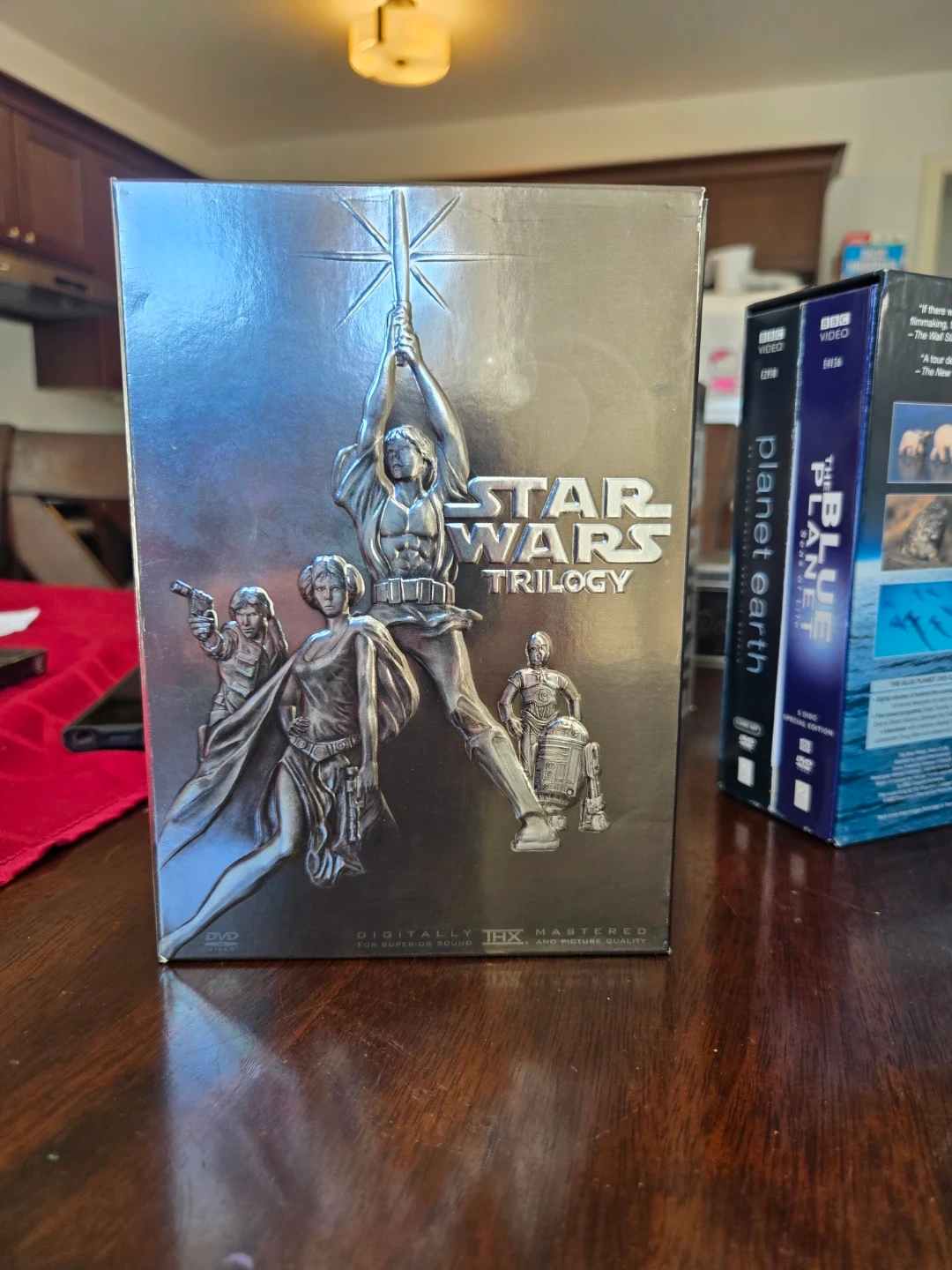 This is the Star Wars Trilogy DVD box set, including Episodes IV, V, and VI. It features widescreen format and THX certified mastering for superior sound and picture quality. A bonus material disc is also included in this collection.