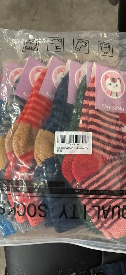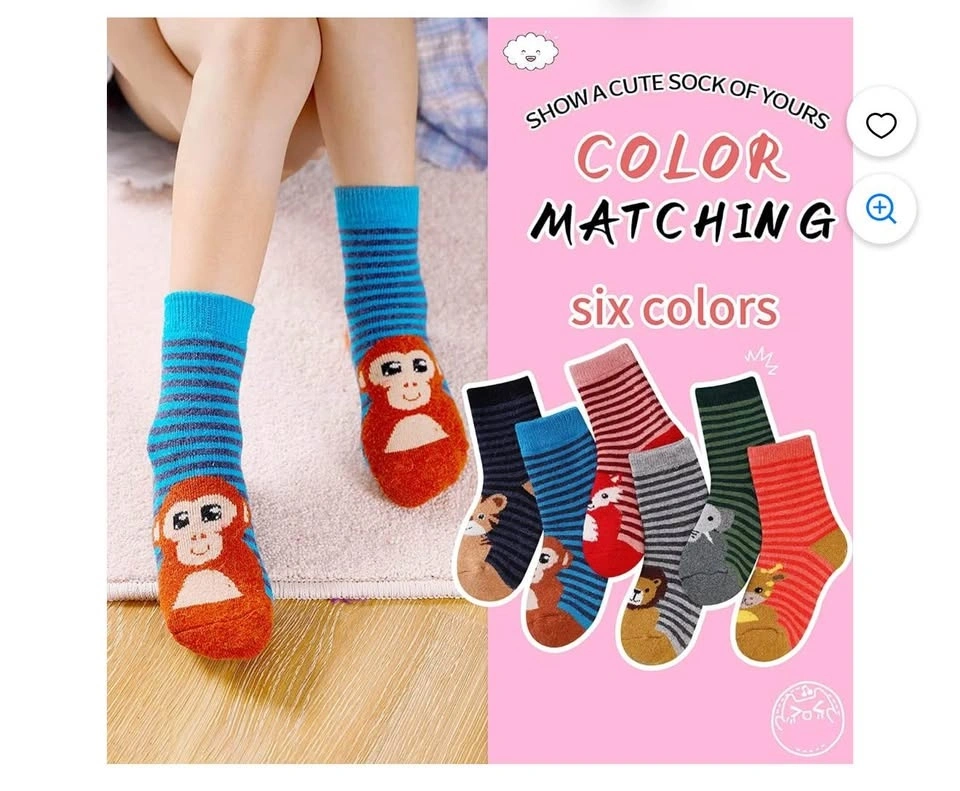 Soft and cozy kids socks. Has 6 pairs with cute animal faces like monkey, fox, lion, elephant, tiger, and giraffe. Each pair has striped patterns. Super soft, thick, and fuzzy inside for warm feet.
