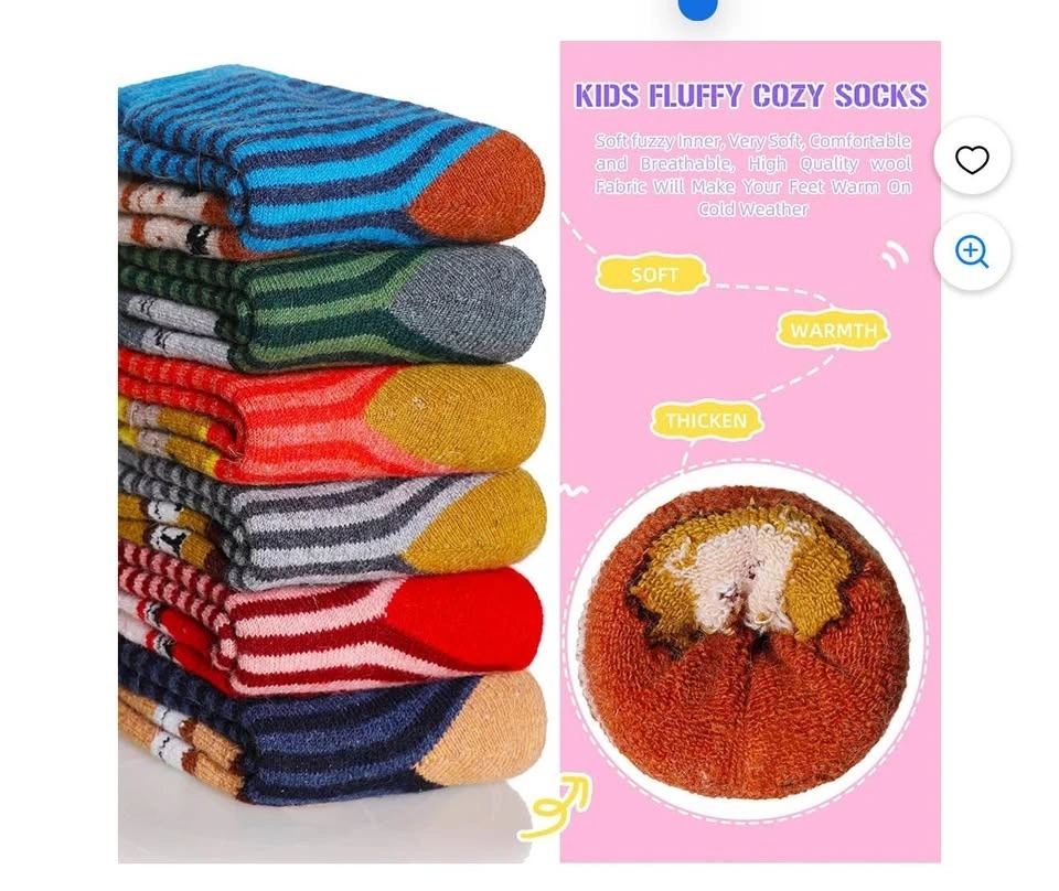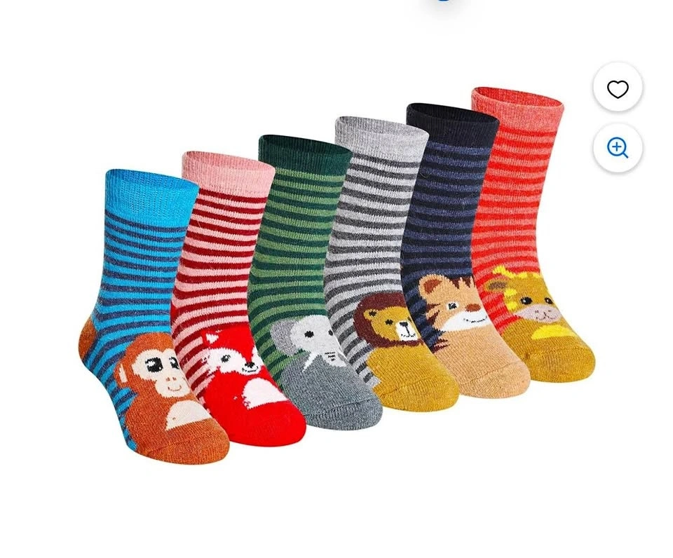 Soft and cozy kids socks. Has 6 pairs with cute animal faces like monkey, fox, lion, elephant, tiger, and giraffe. Each pair has striped patterns. Super soft, thick, and fuzzy inside for warm feet.