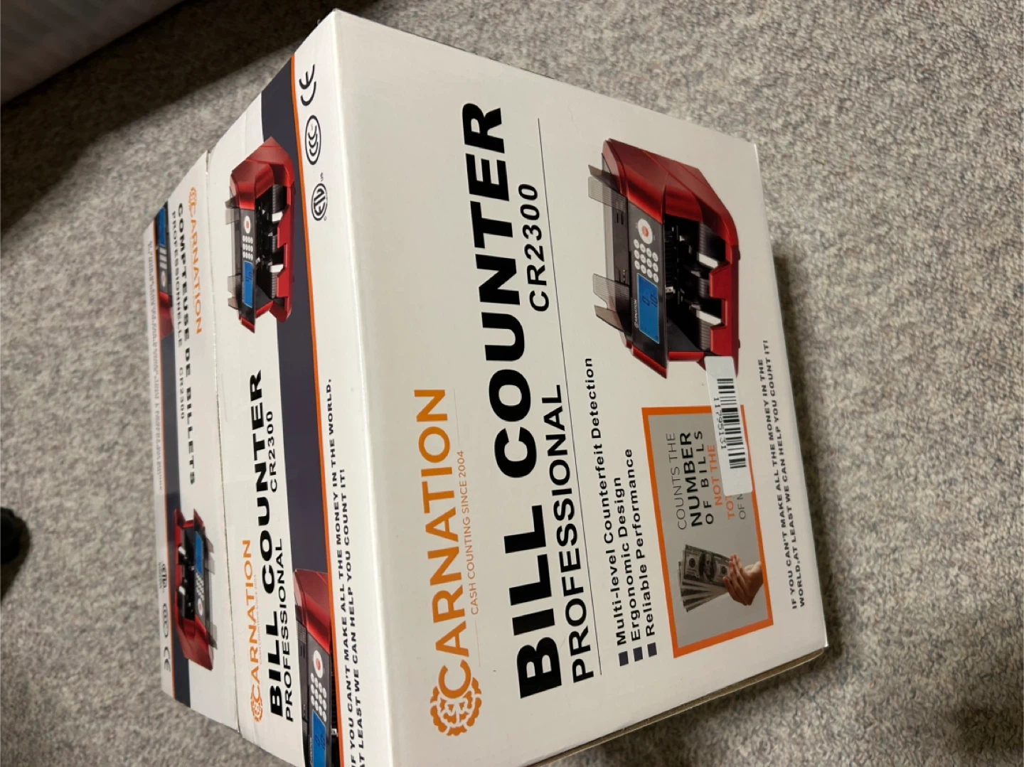 Carnation CR2300 professional bill counter. Counts up to 1500 bills per minute with UV, MG, and IR counterfeit detection. Includes original box and adapter. Ideal for busy cash-handling environments!