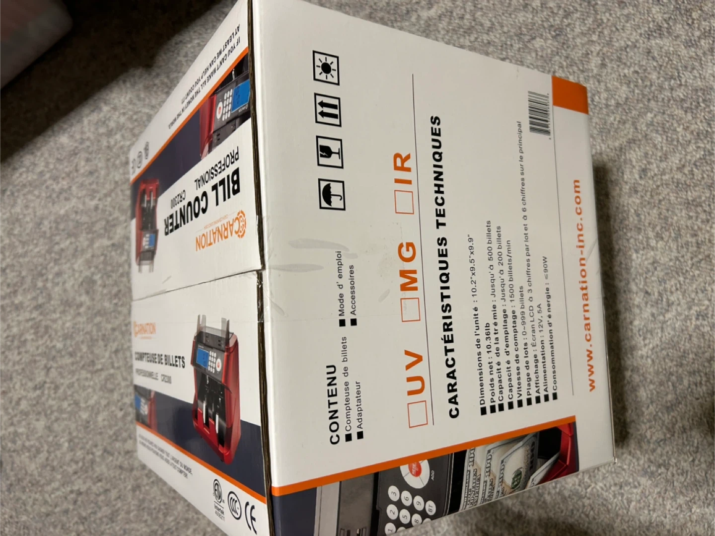 Carnation CR2300 professional bill counter. Counts up to 1500 bills per minute with UV, MG, and IR counterfeit detection. Includes original box and adapter. Ideal for busy cash-handling environments!