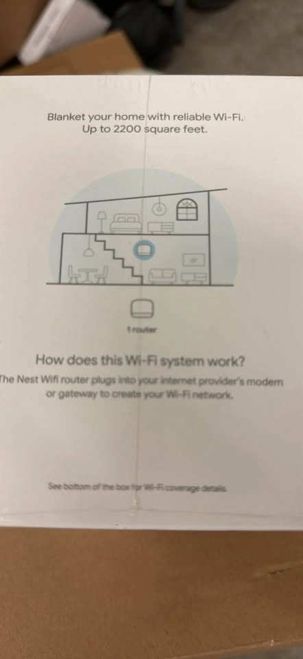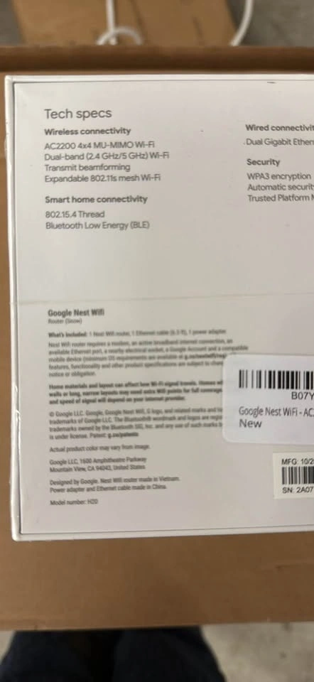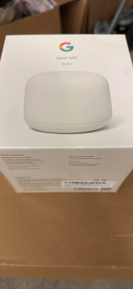 Brand new Google Nest WiFi router with AC2200, 4x4 MU-MIMO Wi-Fi, dual-band (2.4 GHz/5 GHz) Wi-Fi, transmit beamforming, and expandable 802.11s mesh Wi-Fi. Has dual Gigabit Ethernet ports and WPA3 encryption. Covers up to 2200 square feet.