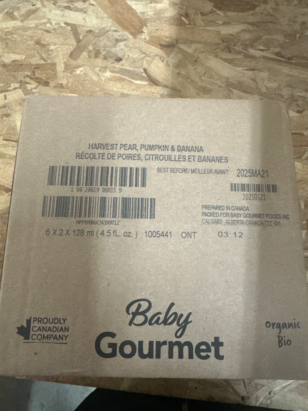 Baby Gourmet organic baby food pouches with a harvest pear, pumpkin, and banana flavour. Each pouch is 128 ml x 12 pack (4.5 fl. oz.). Best before May 2025.
