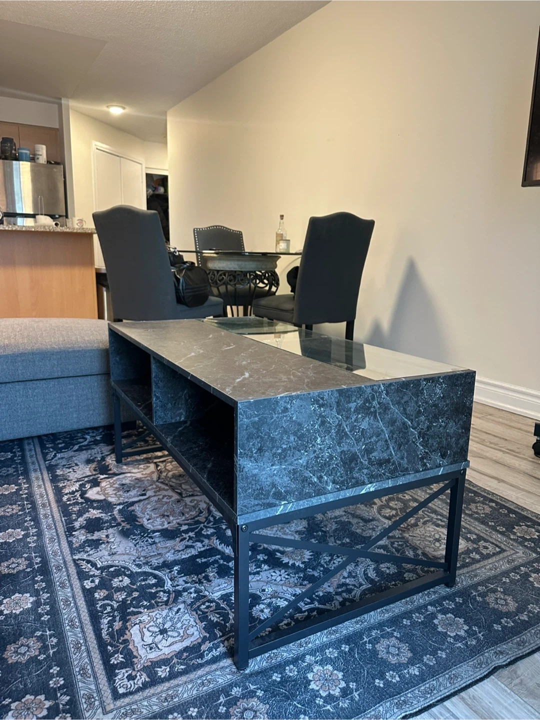 This coffee table has a faux marble finish with a clear glass top. It features four open storage shelves and a black metal frame. It's perfect for a living room or den.